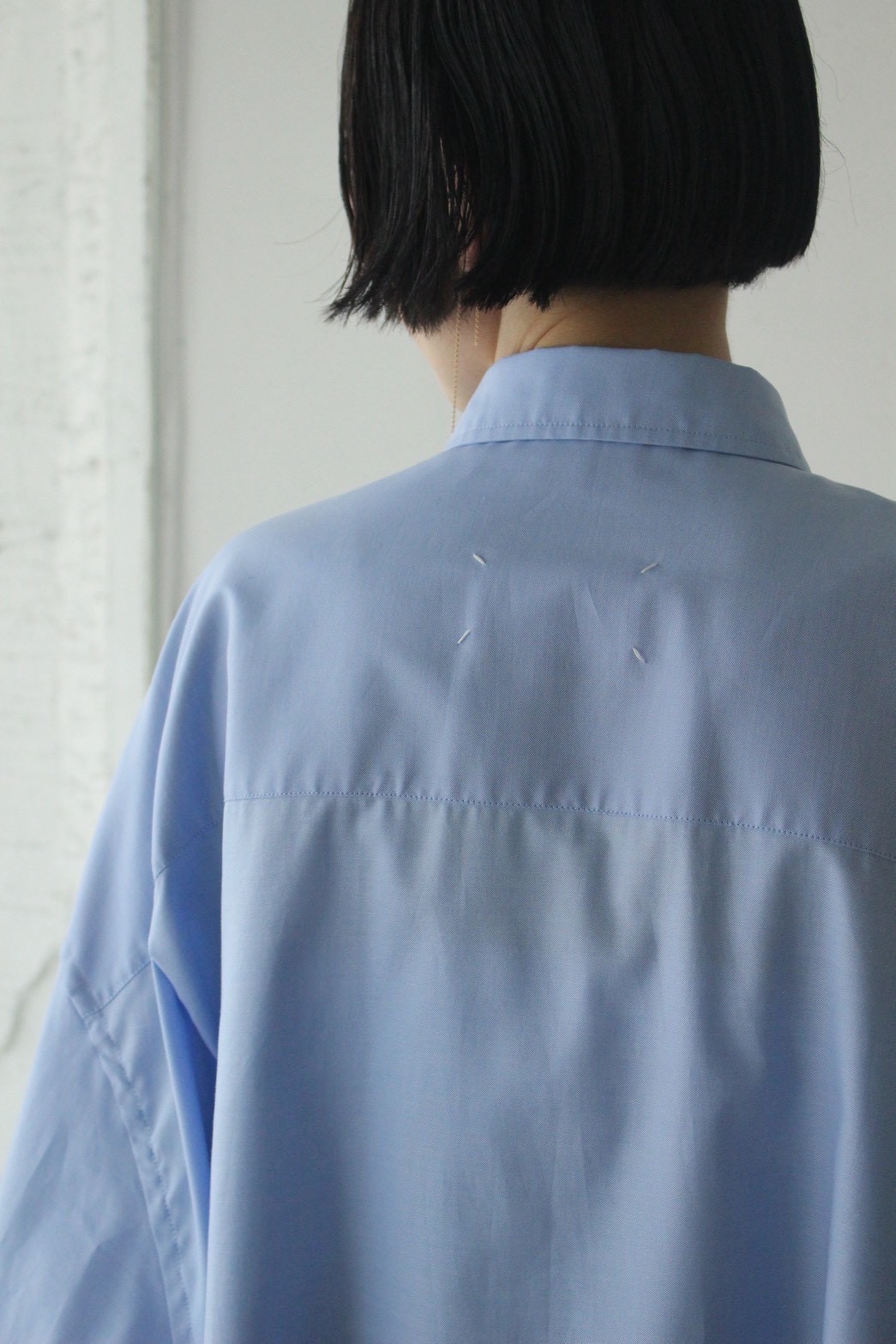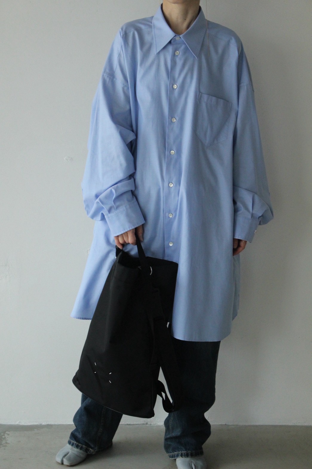 ライトブルーが際立つオーバーサイズで作られたロングスリーブシャツ。
