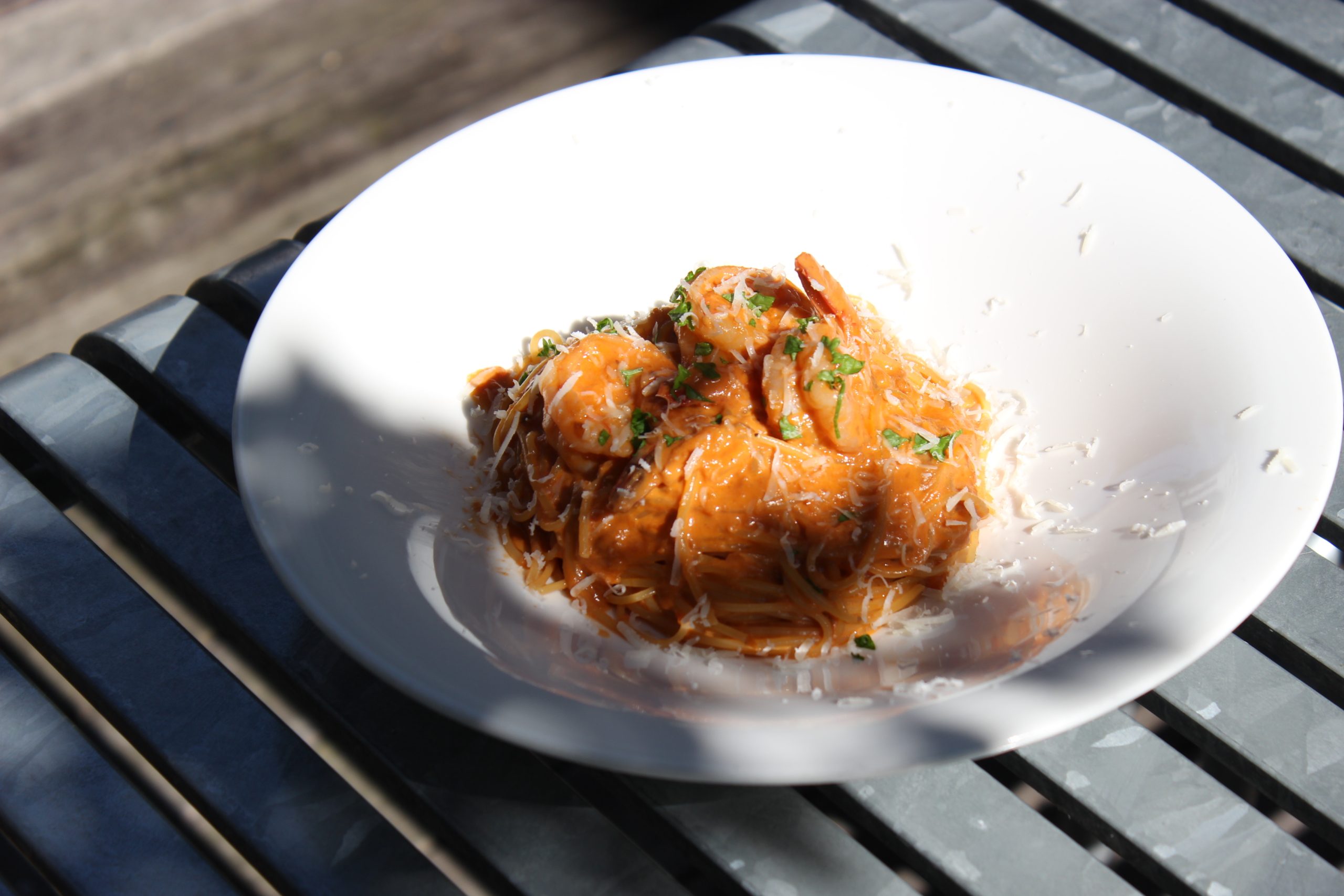 プリッとした海老とハーブを効かせたトマトクリームソース。