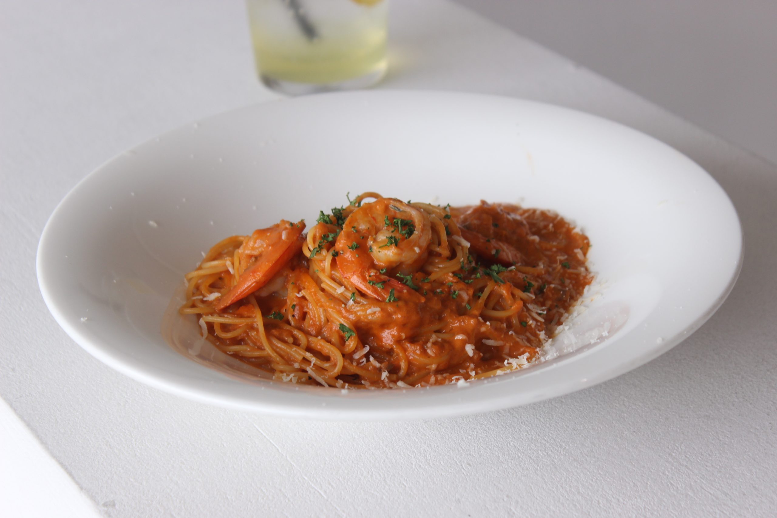 プリッとした海老とハーブを効かせたトマトクリームソース。