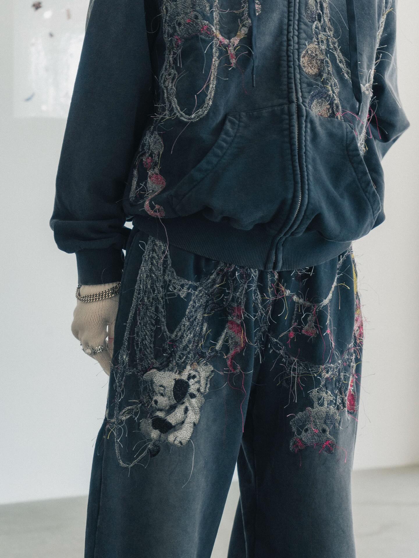 一見シンプルなスウェットながら、近くで見ると刺繍の立体感と細かさが際立ち、ただの楽なパンツで終わらない仕上がりです。