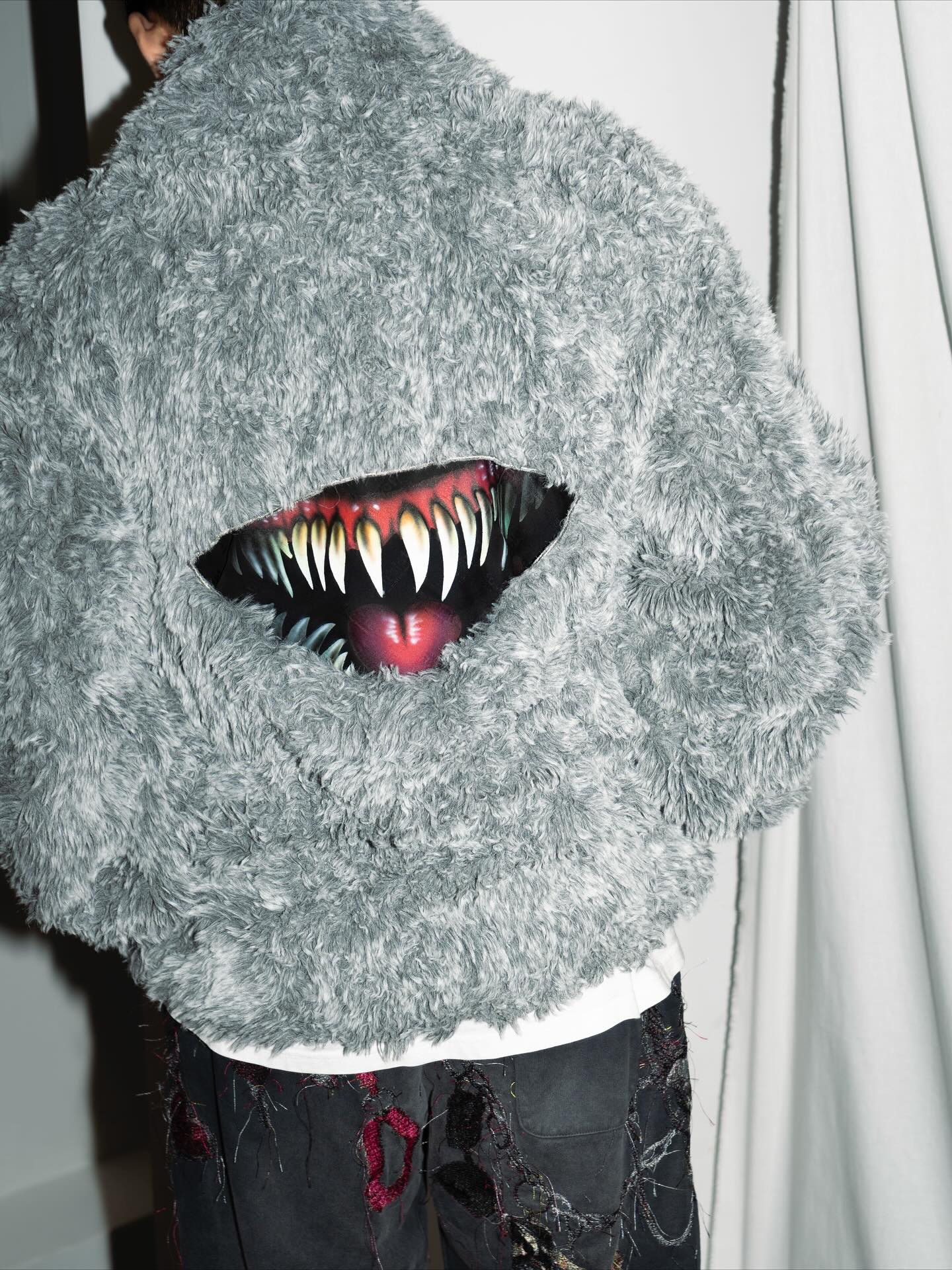 最大の特徴は、インパクトのある“口”をモチーフにしたグラフィカルな表現。それをフェイクファーという素材で落とし込むことで、視覚的な強さと柔らかさを同時に成立させています。