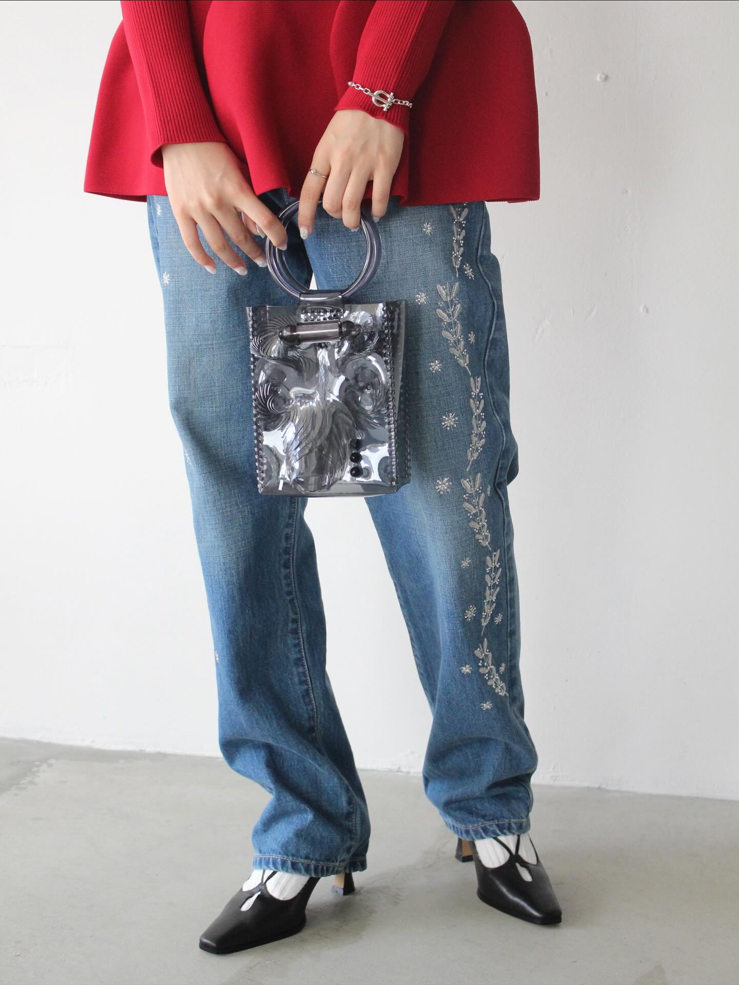 ベーシックなインディゴデニムをベースに、繊細な刺繍ディテールを施すことで、シンプルながらも確かな存在感を放ちます。