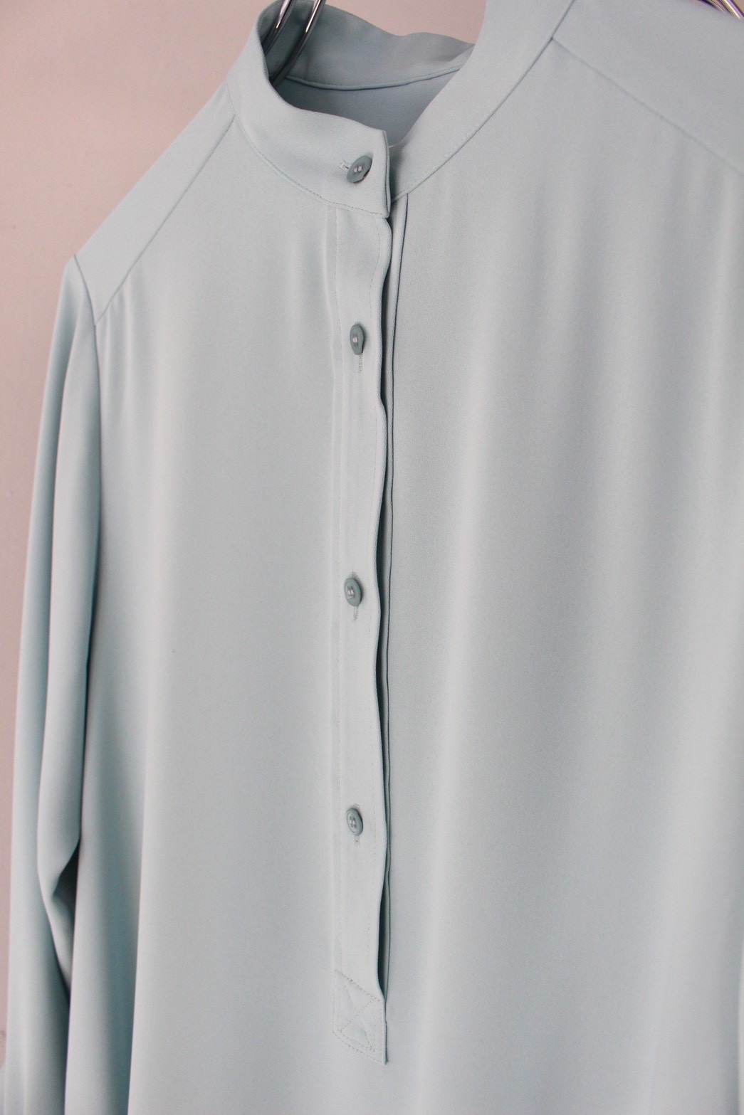 肩はコンパクトでスッキリとしたシルエットの柔らかく落ち感のあるダブルサテンを使用したバンドカラードレス。シワになりにくく日常的に使える利便性も兼ね備え、たっぷりとしたボリュームのある生地が歩くたびに揺れて美しい優美なドレープ感が高揚感のある1着です。