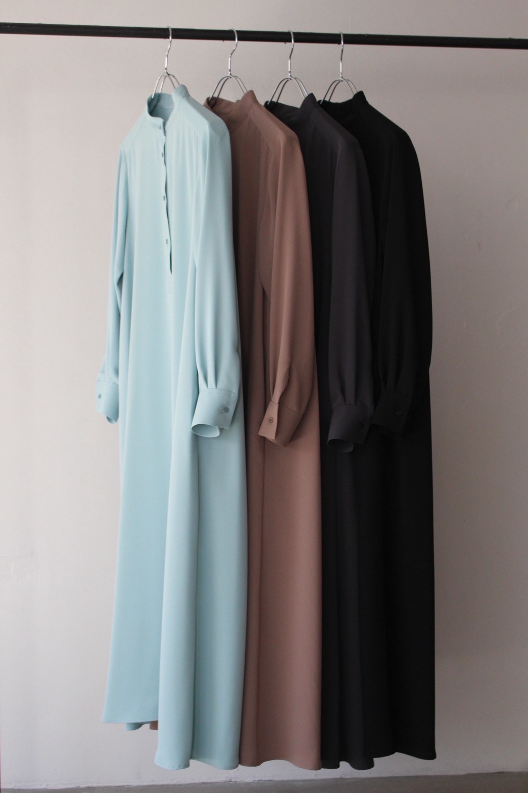 肩はコンパクトでスッキリとしたシルエットの柔らかく落ち感のあるダブルサテンを使用したバンドカラードレス。シワになりにくく日常的に使える利便性も兼ね備え、たっぷりとしたボリュームのある生地が歩くたびに揺れて美しい優美なドレープ感が高揚感のある1着です。