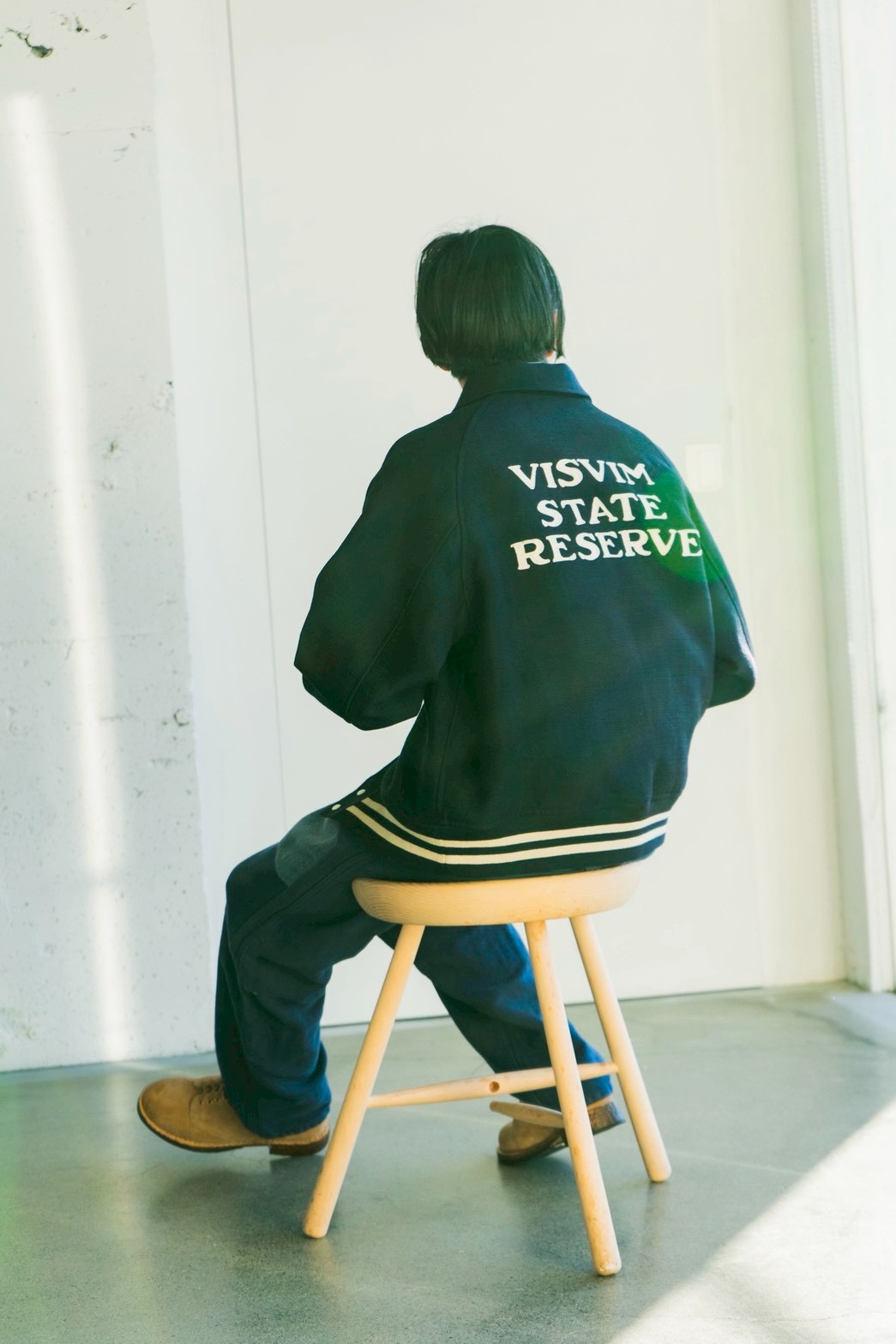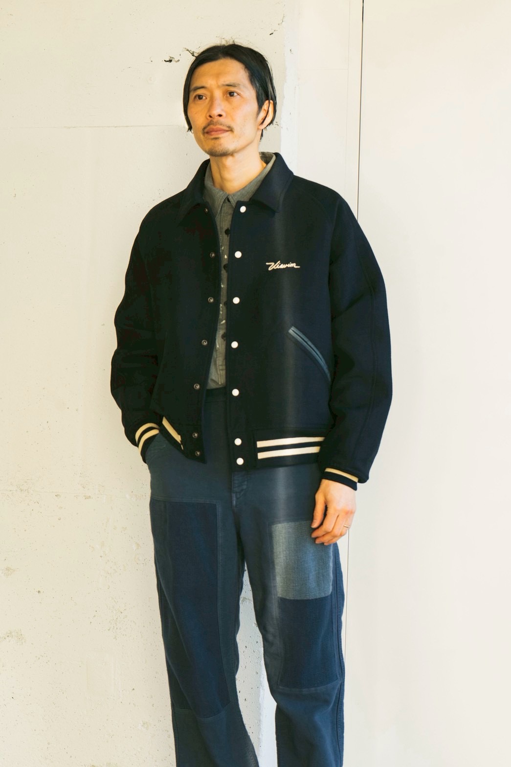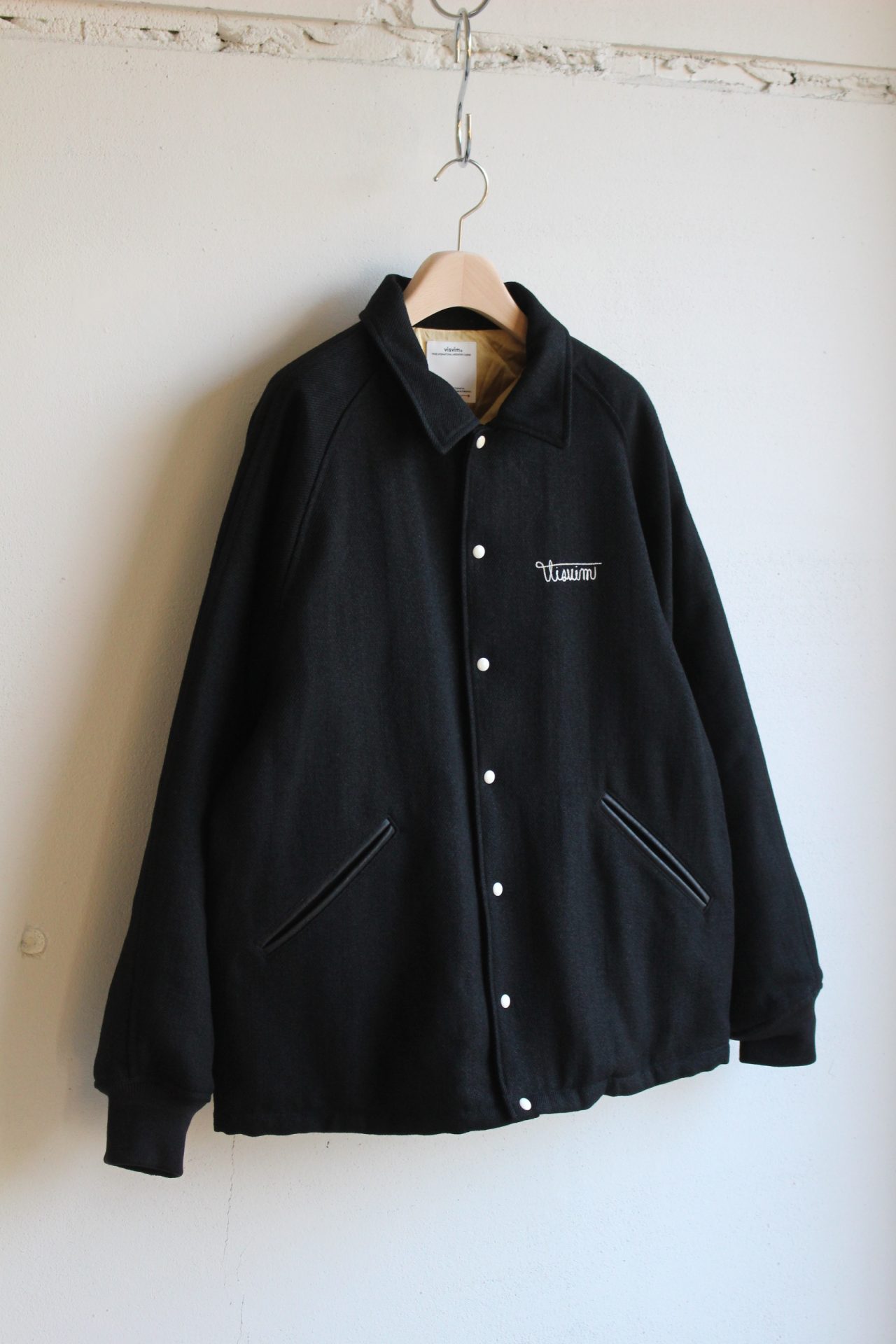 レザーの両玉縁ポケットやオリジナルリブ、胸と背中に施されたハンドル刺繍など、クラシックなスタジアムジャケットを土台にしながら、visvimらしい素材使いと品のある佇まいに昇華された一着です。
