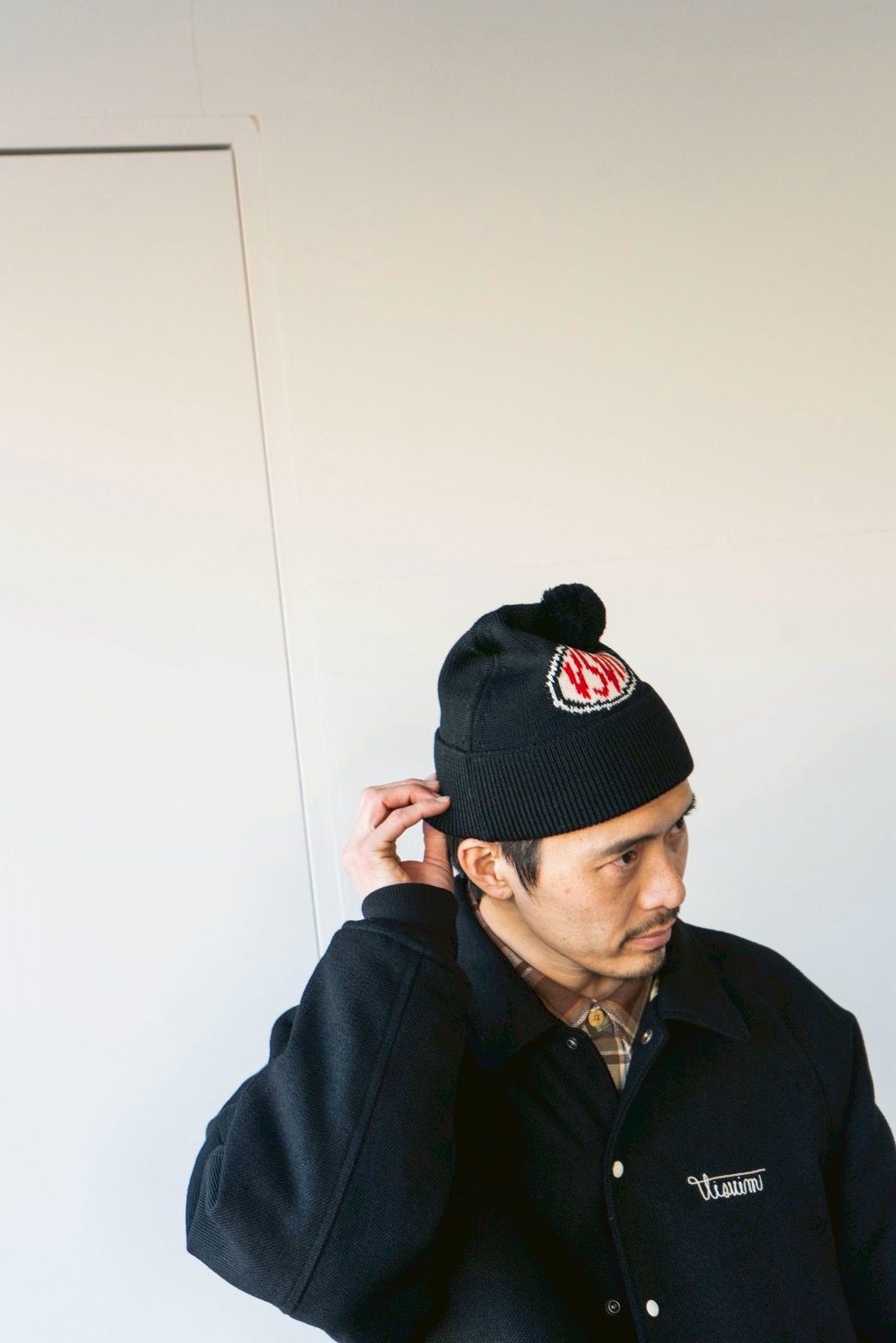 インターシャ編みで表現された“VSVM”ロゴが、さりげないアクセントとしてスタイリングに馴染みます。