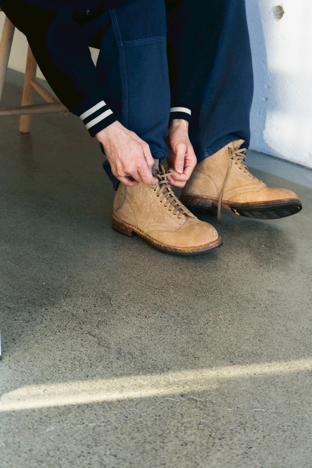 コルクインソールやレザーミッドソール、Vibramアウトソールによる実用性に加え、あらかじめ施されたソールのダメージ加工が自然な佇まいを演出。