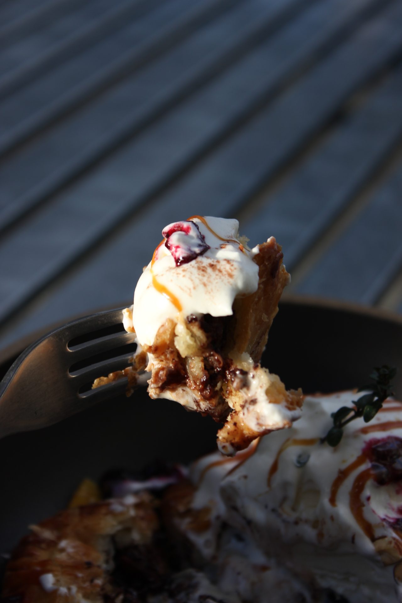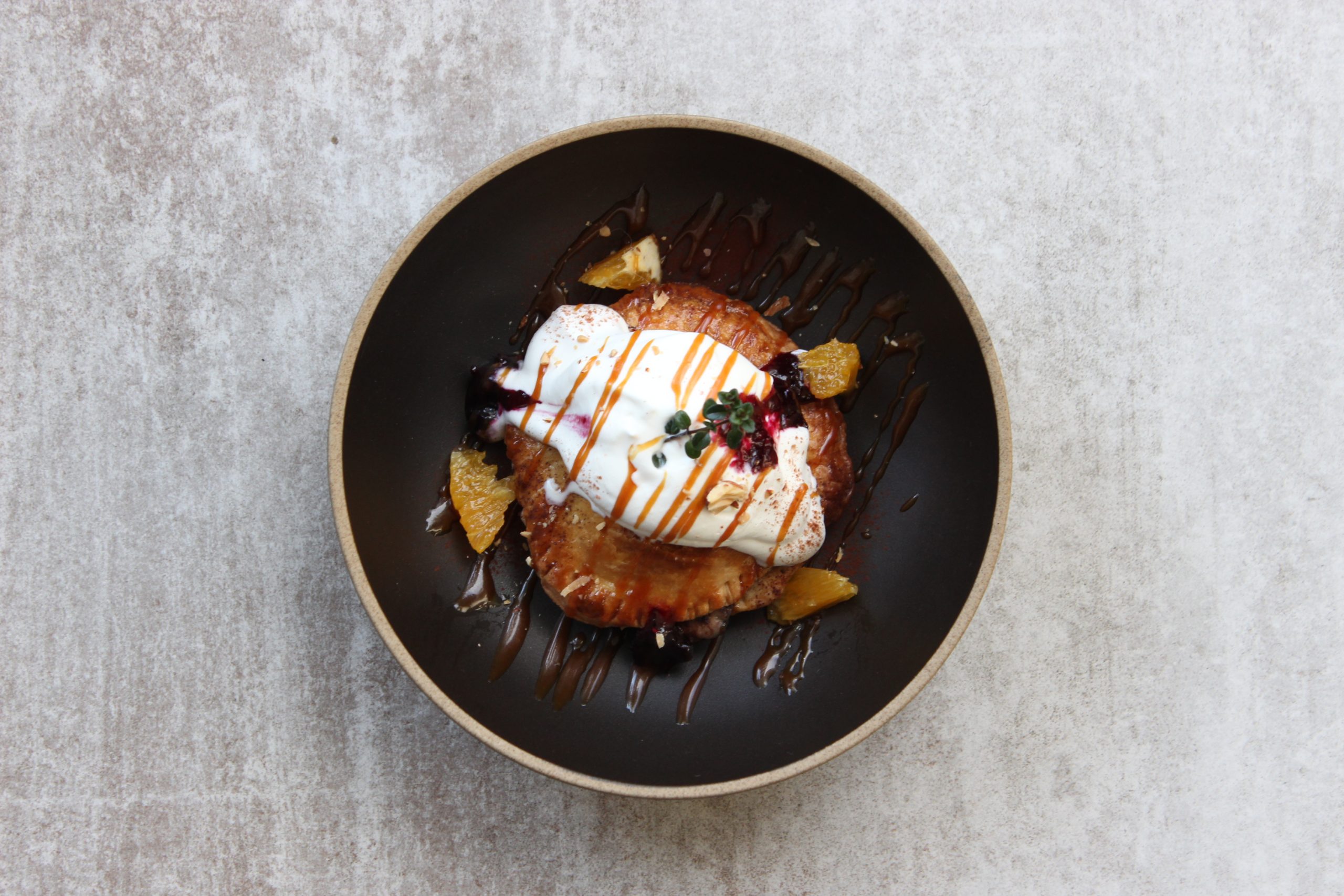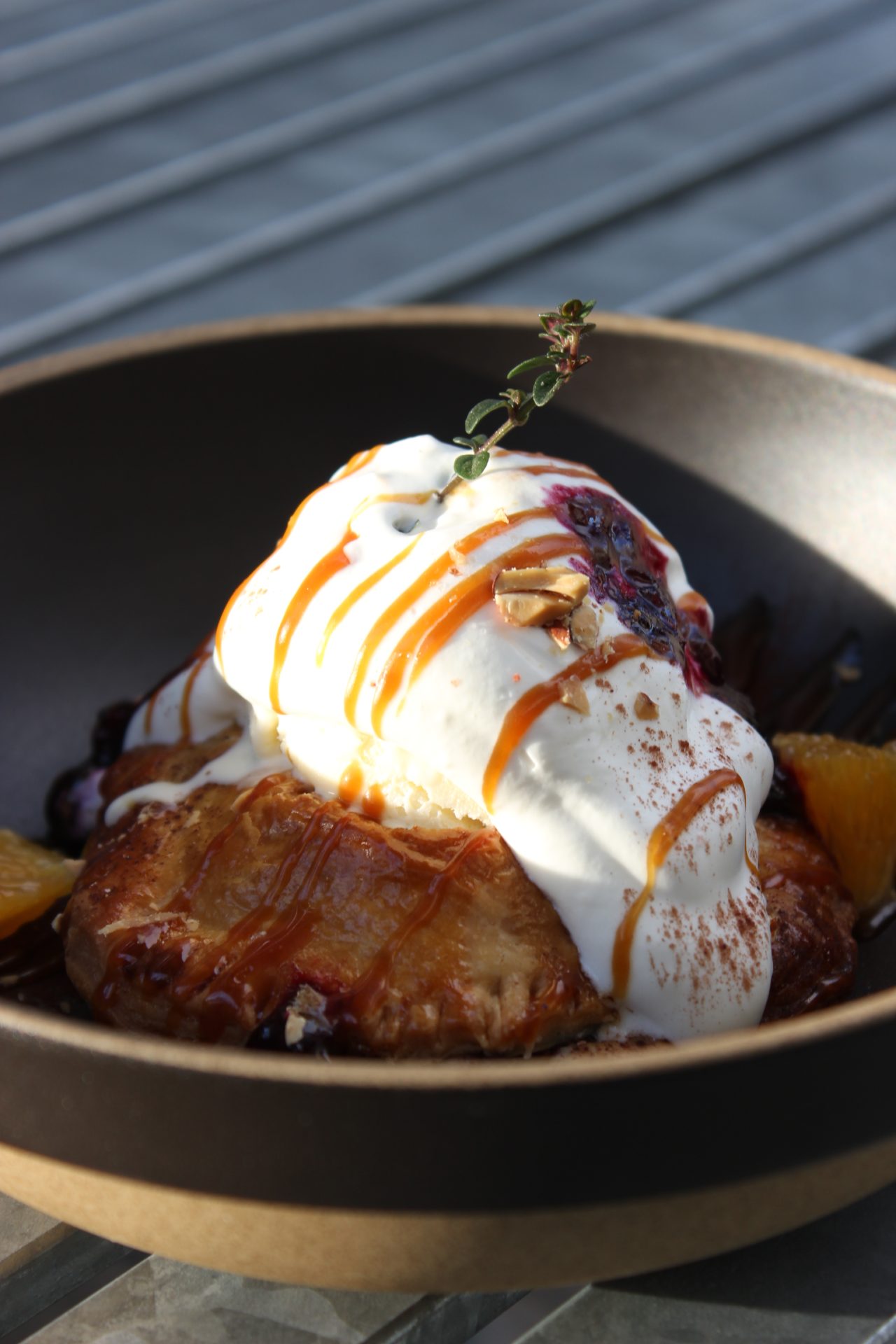 パイの上にはバニラアイスとホイップクリームを乗せて香ばしさのある自家製キャラメルと爽やかなベリーソースで仕上げました。