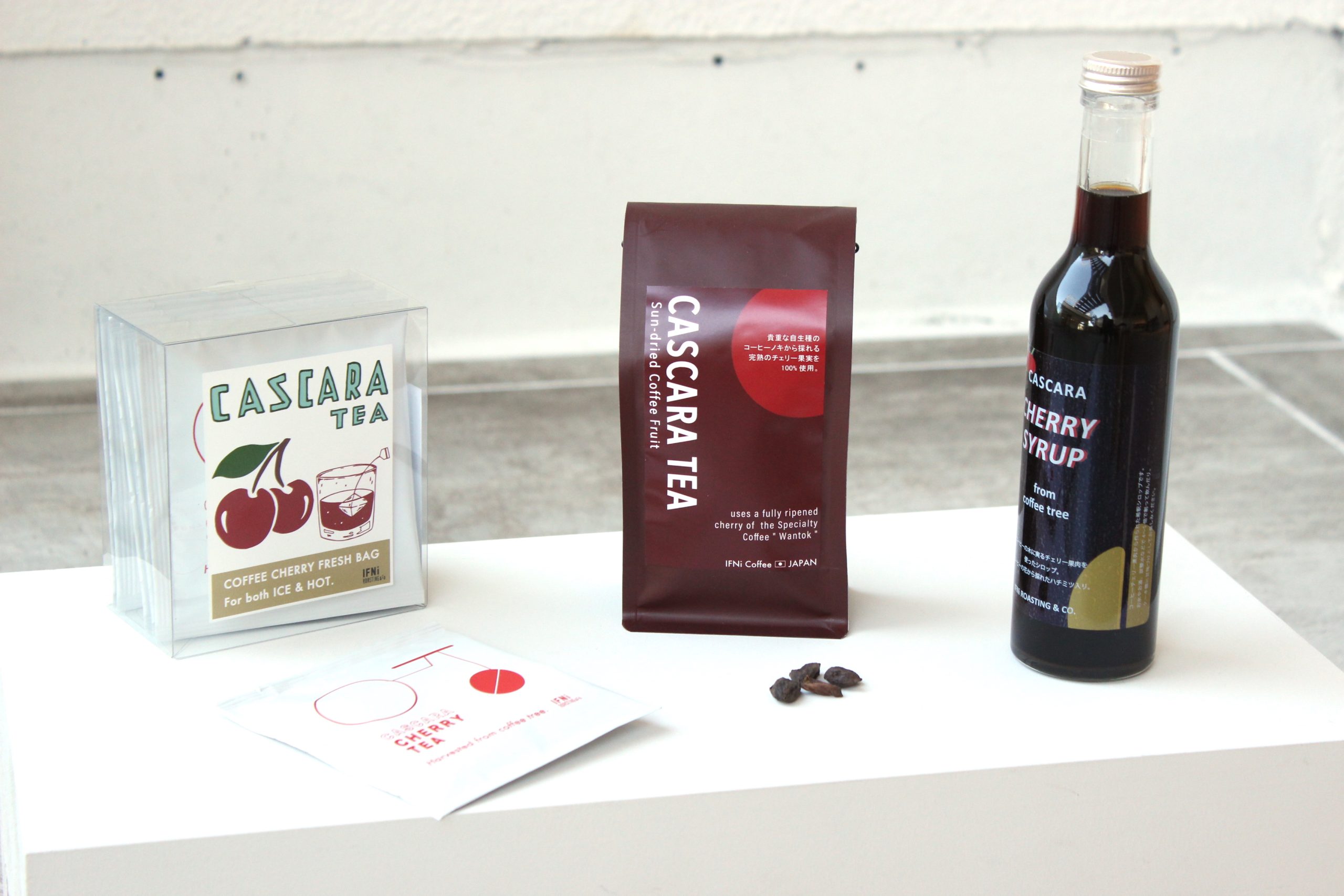 カフェ店頭にて販売しているIFNI COFFEE ROASTINGの3種類のカスカラ関連グッズ。