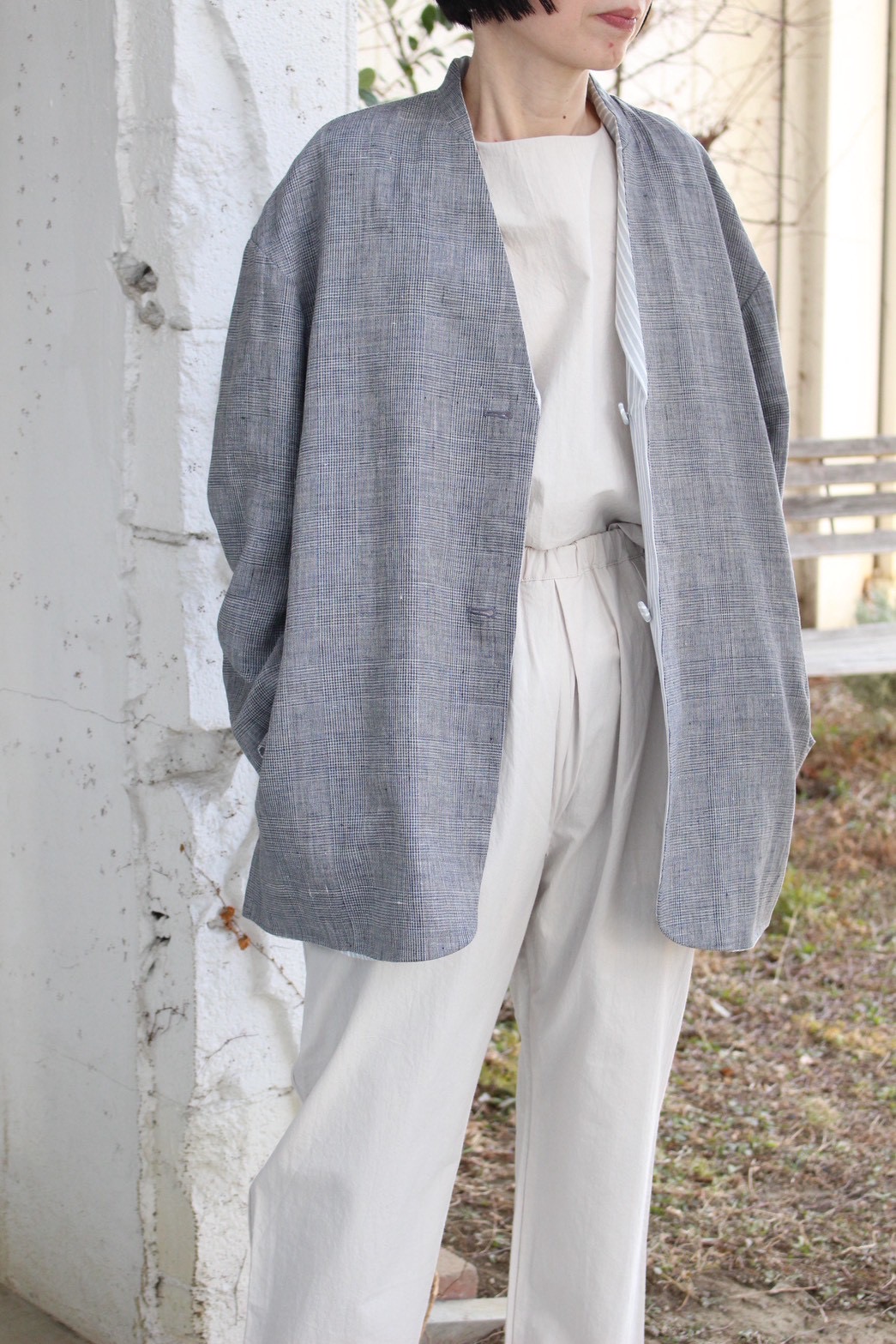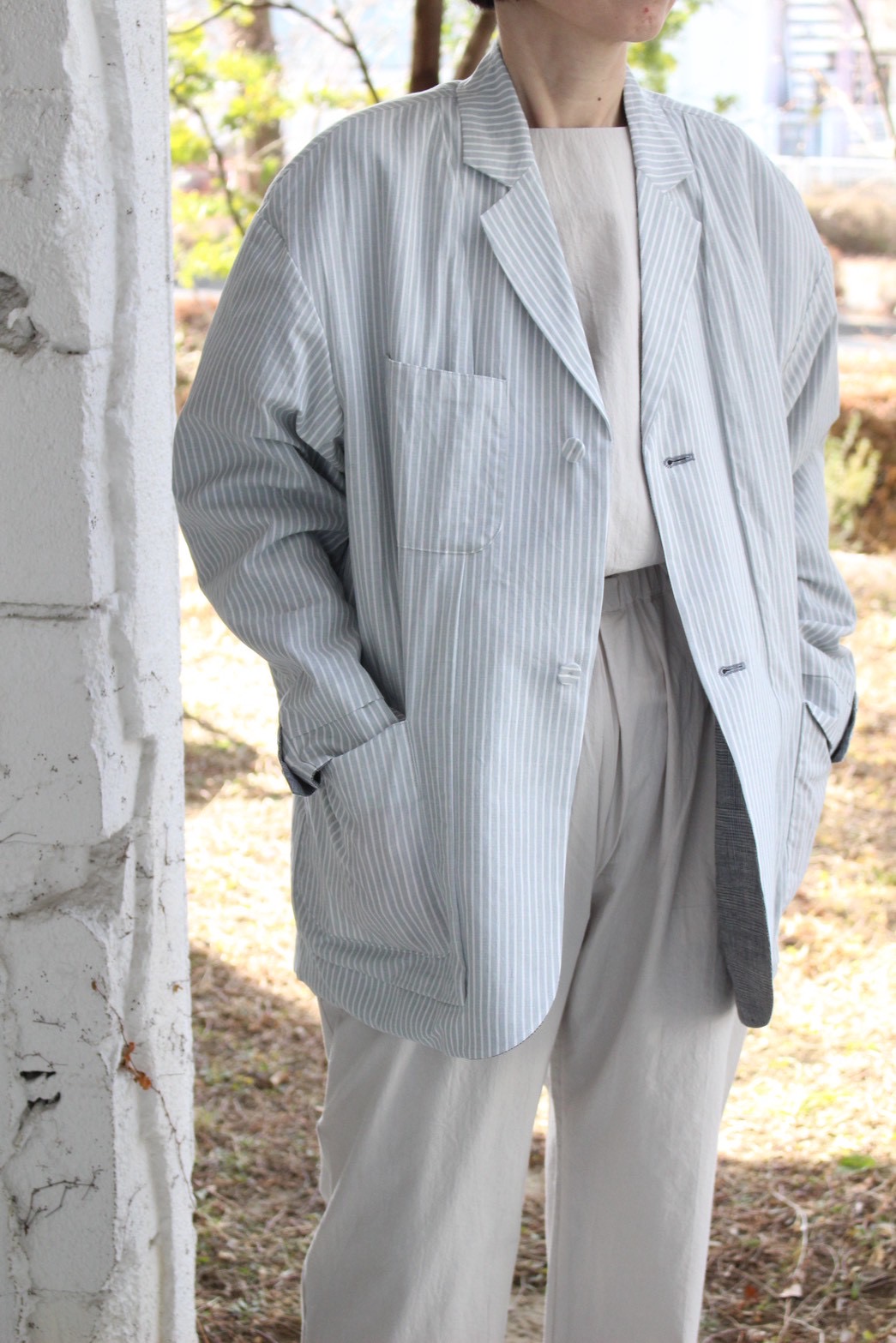 テーラードの襟が内側にたたまれたユニークなリバーシブルジャケット。