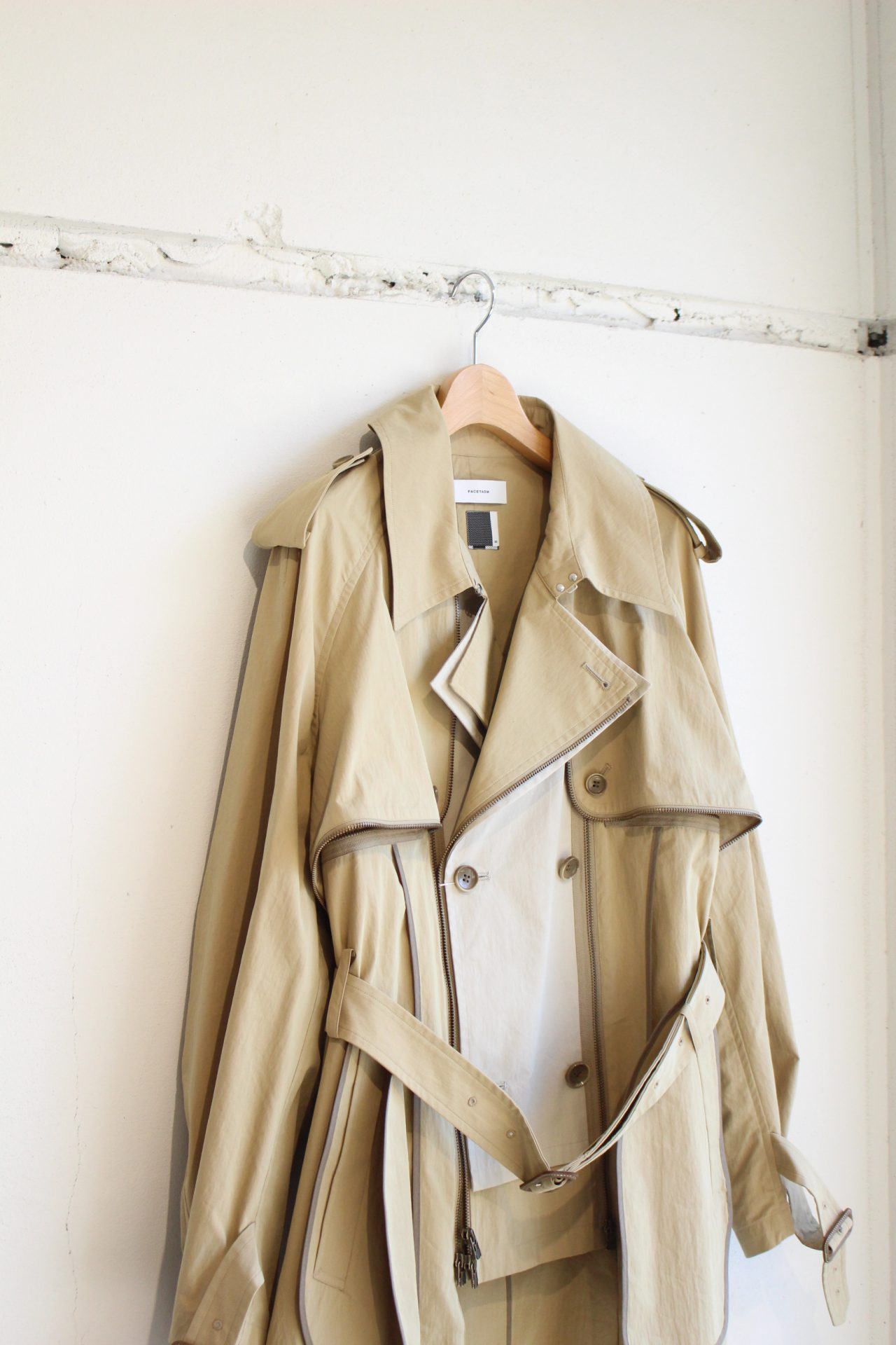 クラシックなトレンチコートをベースに、レイヤード構造を組み込んだFACETASMらしい再構築デザイン。