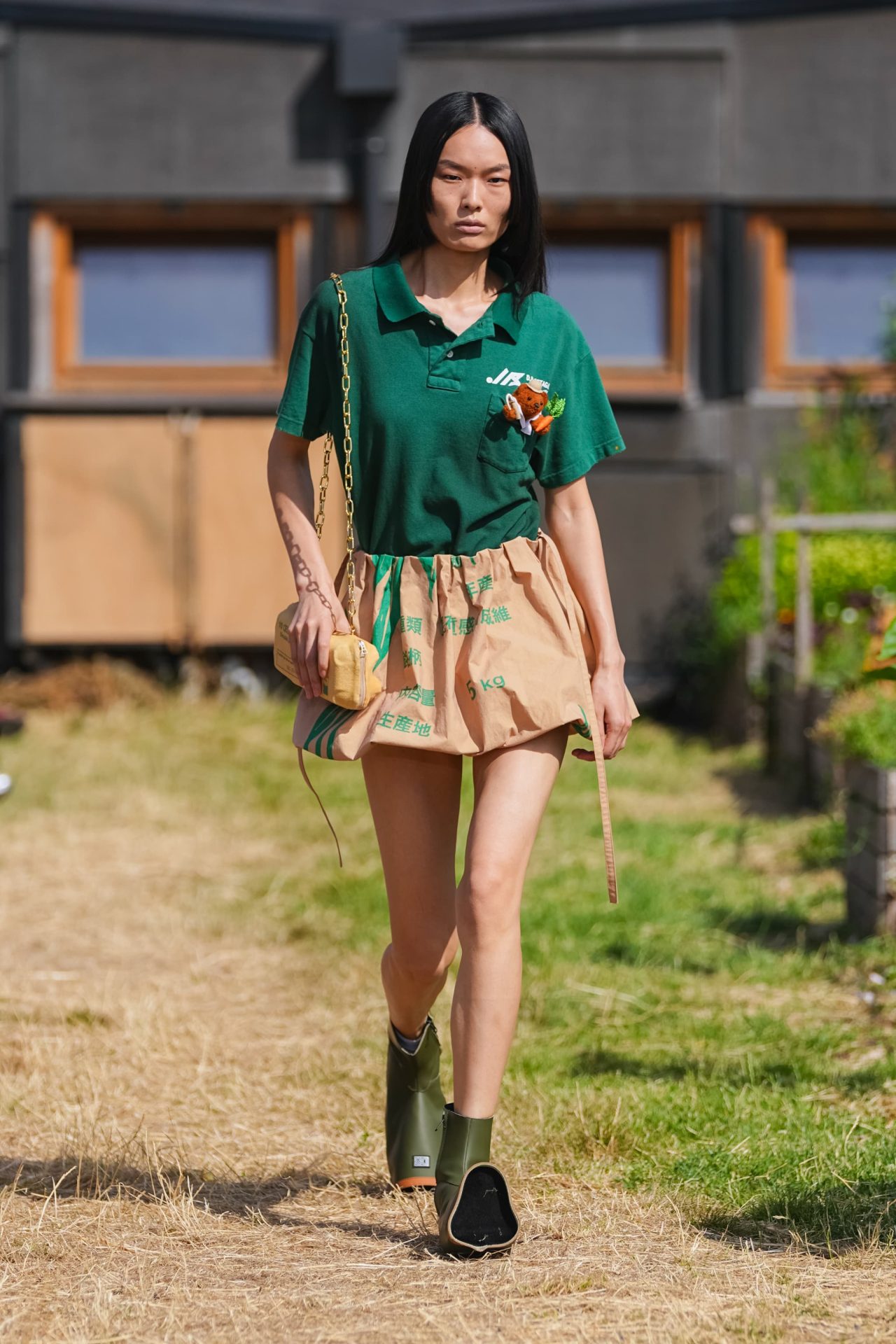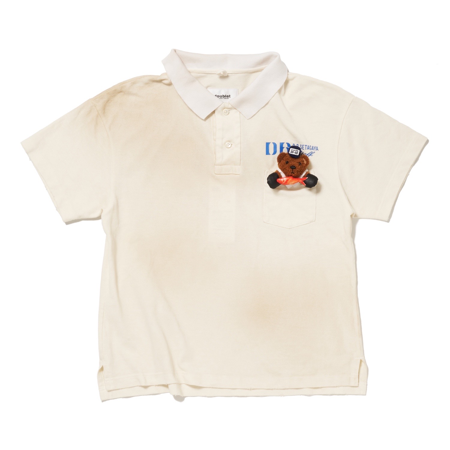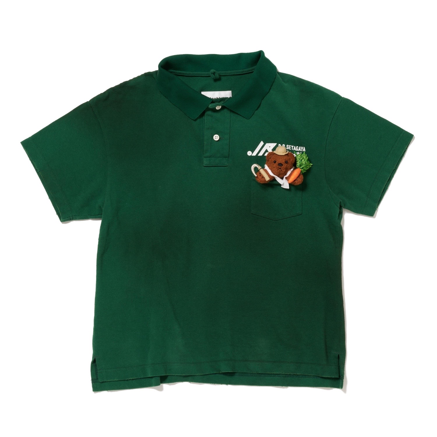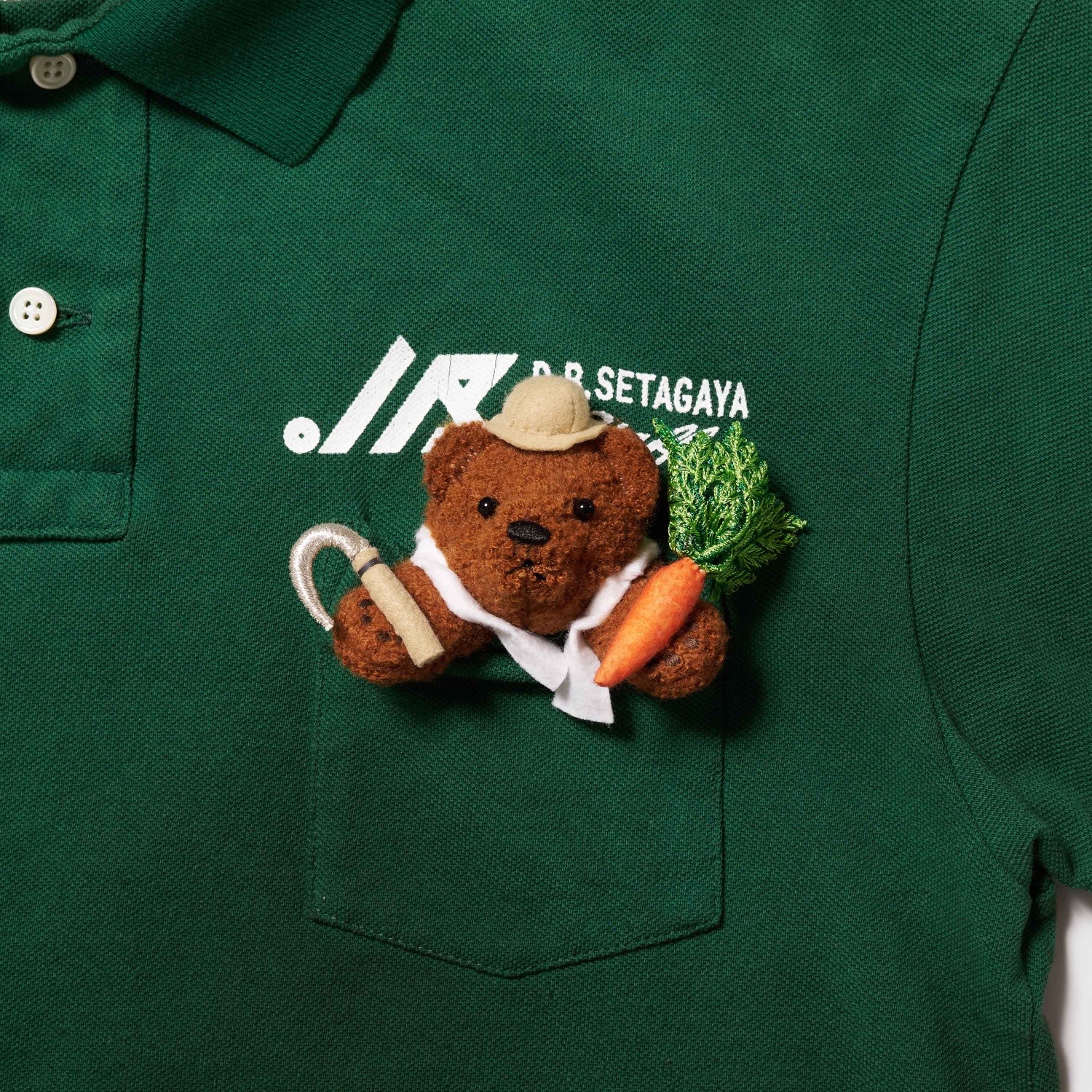 すっきりとしたシルエットのポロシャツに、にんじんを収穫する農作業ベアや、金目鯛を競りに出す漁業ベアを胸元に配置。ワッペン調のグラフィックと、ぬいぐるみのような立体刺繍がユーモラスに働いています。