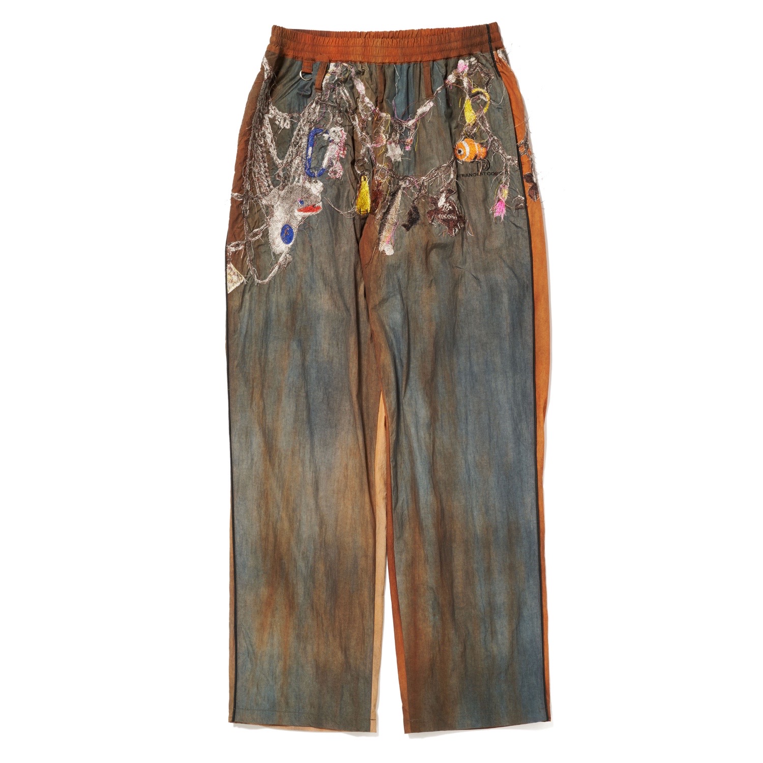 スプレーでムラ染め加工を施したナイロン素材のトラックパンツ。ポケット周りには、魚やルアーのチャームを連ねたチェーン刺繍をあしらい、立体的な存在感を加えています。ジャケットとのセットアップも可能な一本です。