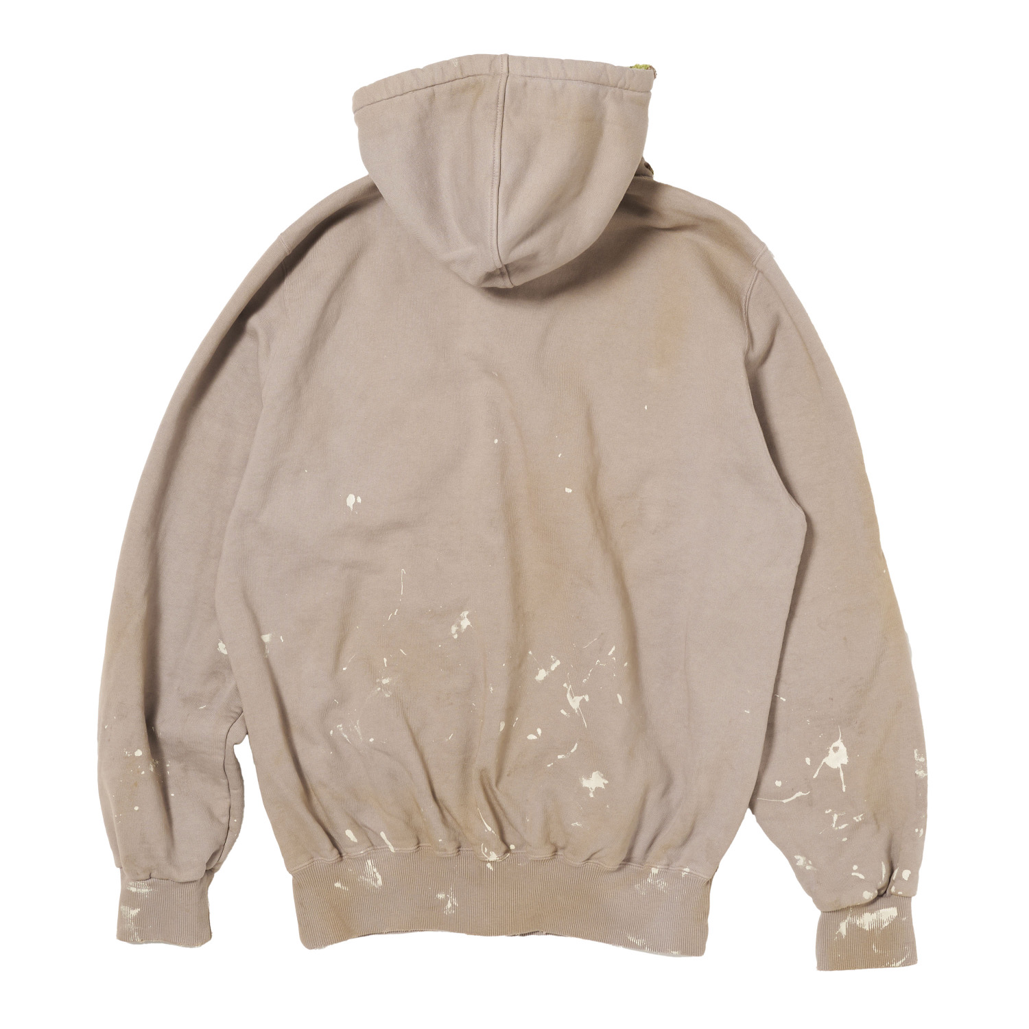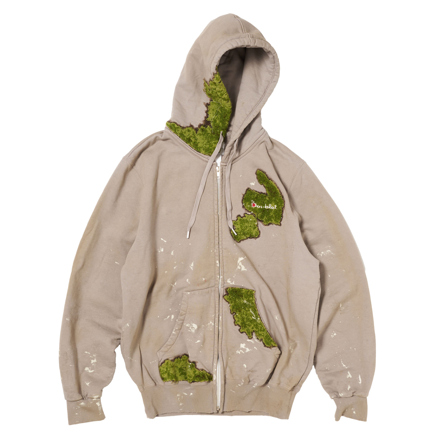 ペンキを飛ばしたような加工と立体刺繍を組み合わせ、コンクリートの隙間から苔が芽吹く風景をフーディーで表現。裏毛素材のボディに自然の生命力を宿した一着です。