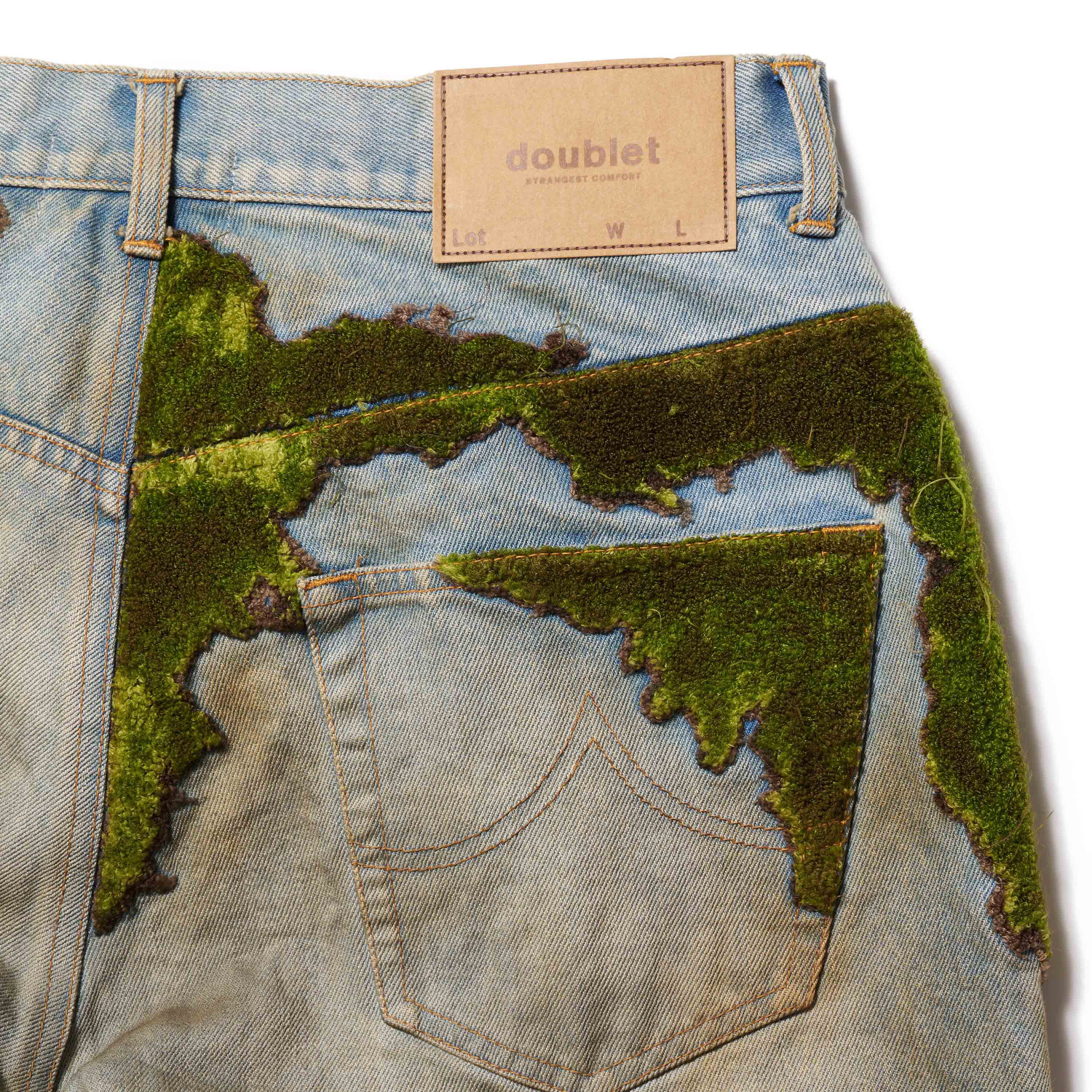 ユーズド加工を施したデニムに立体刺繍を加え、ウエストやポケット周りに自然と苔が生えたような表情を持たせたパンツ。森に放置された作業着のような佇まいに仕上げています。
