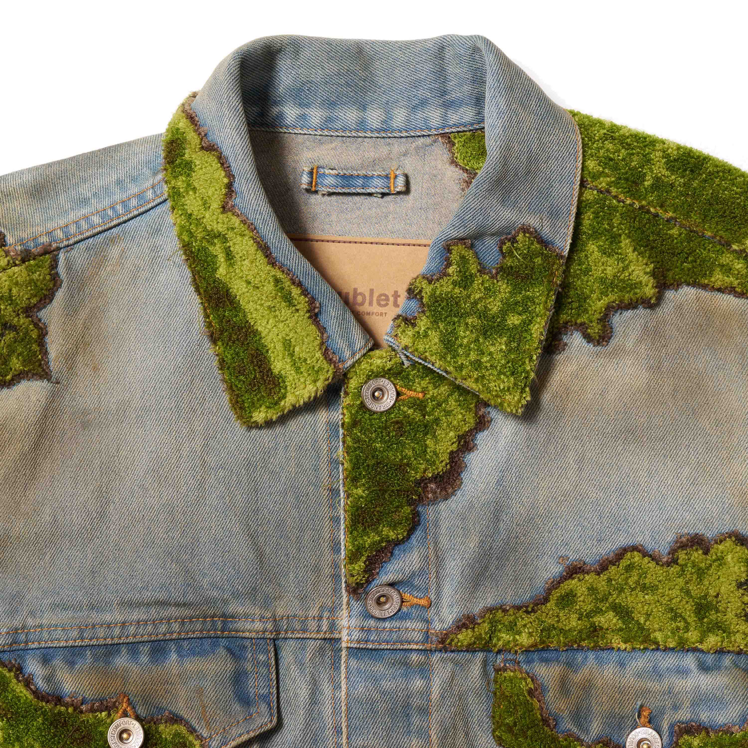 汚れたようなユーズド加工を施したデニムに、立体刺繍を重ねることで、古木に苔が生えるような風景を写し取った一着。時間とともに風景へ溶け込んでいく自然の営みを、衣服としてまとえるよう仕上げています。