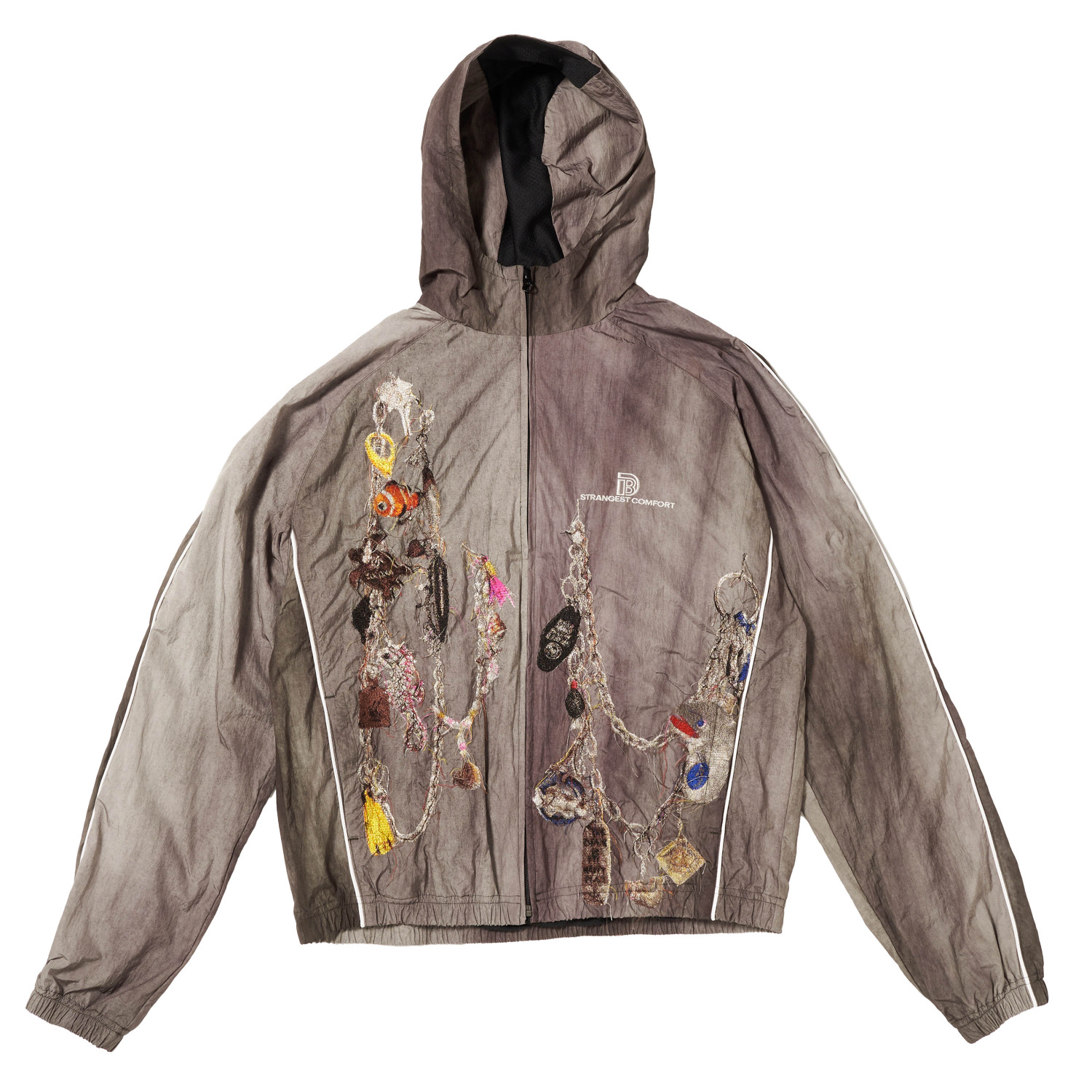 スプレーでムラ染め加工を施したナイロン生地に、魚やルアーをモチーフにしたチャーム付きチェーンを、写真のようにリアルな刺繍で表現したトラックジャケット。フード一体型の軽やかなシルエットは、都会と自然の間を行き来するような佇まいです。