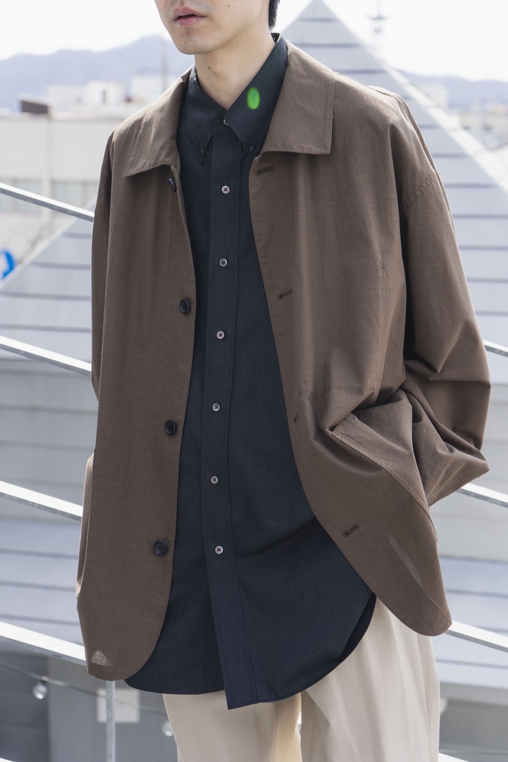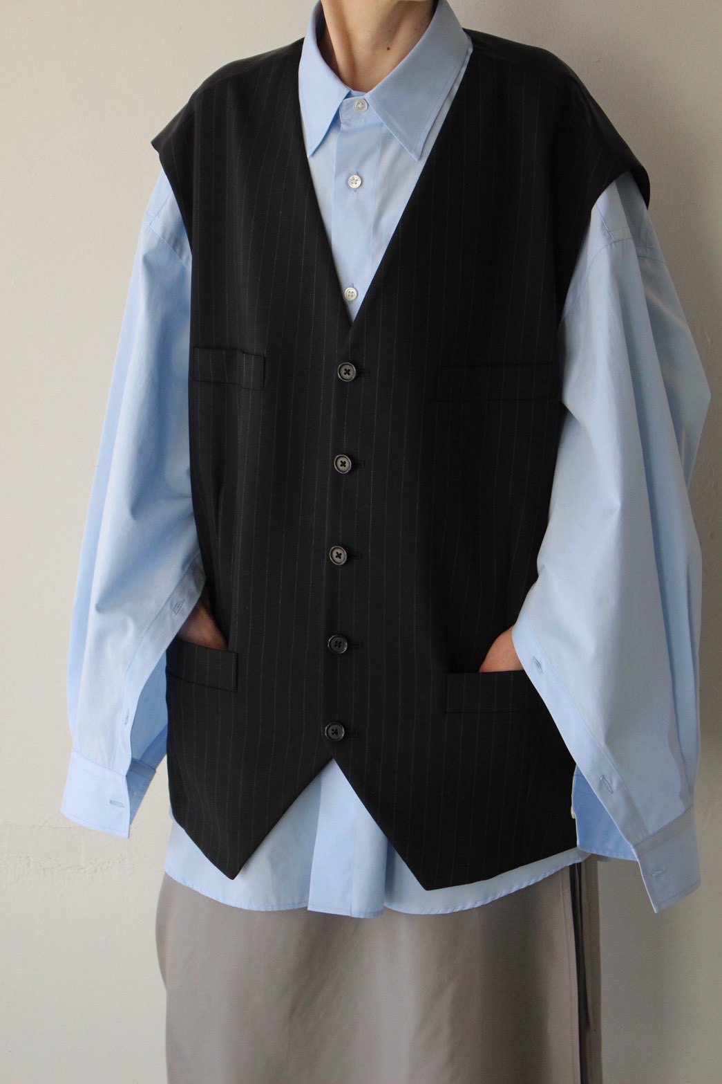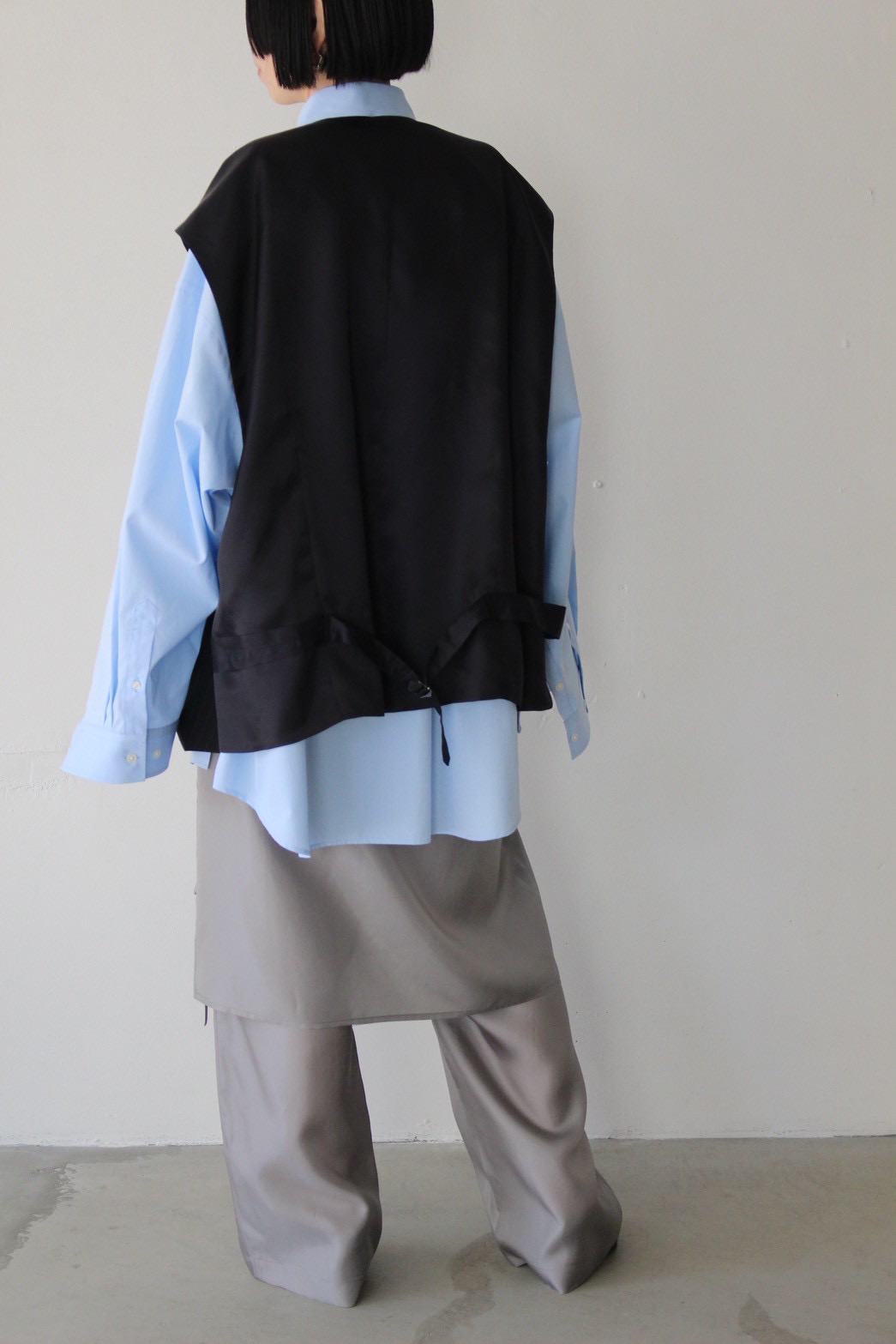 ケープシャツの立体的なフォルムに、ウールオーバーサイズジレを重ねた奥行きのあるレイヤードスタイル。