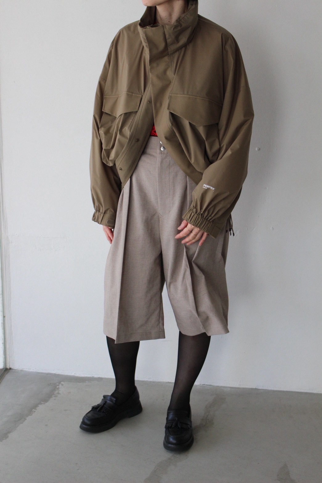PERTEXジャケットの軽やかな立体感に、グルカショーツを合わせた女性らしいバランスのスタイル。