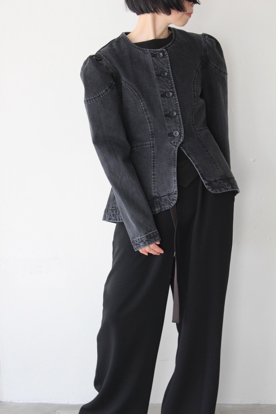 オーガニックコットンデニムを使用し、程よいハリと柔らかな風合いを両立。フェード感のあるブラックカラーがモードな雰囲気を引き立てます。