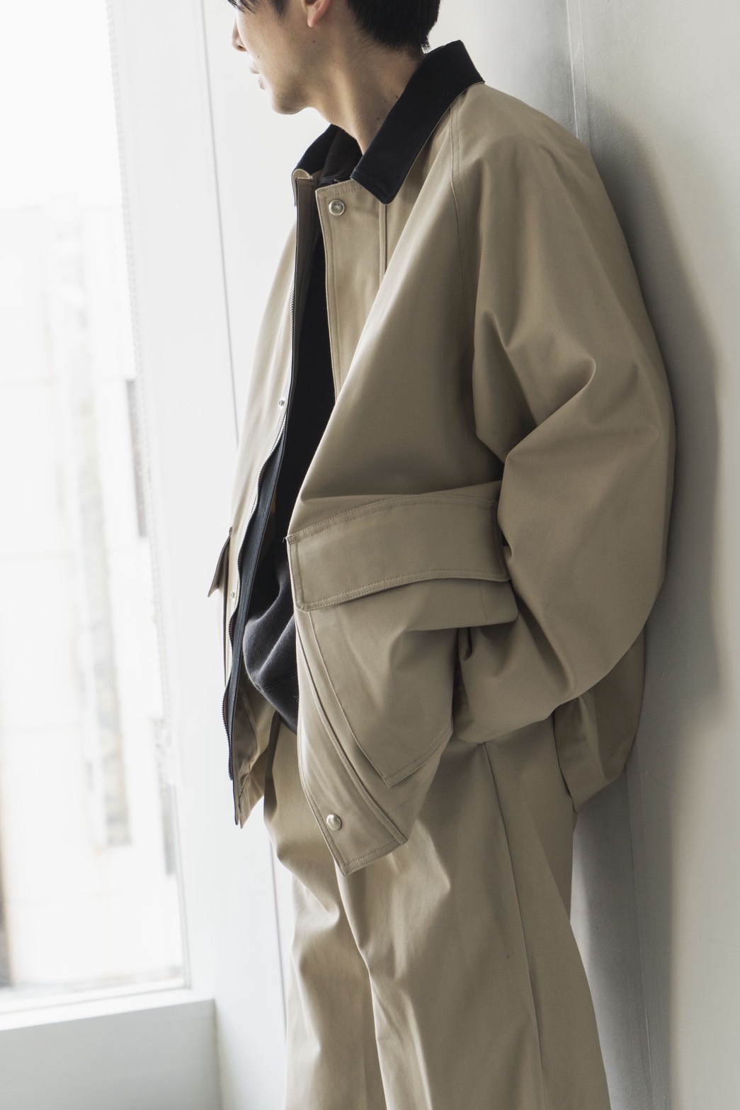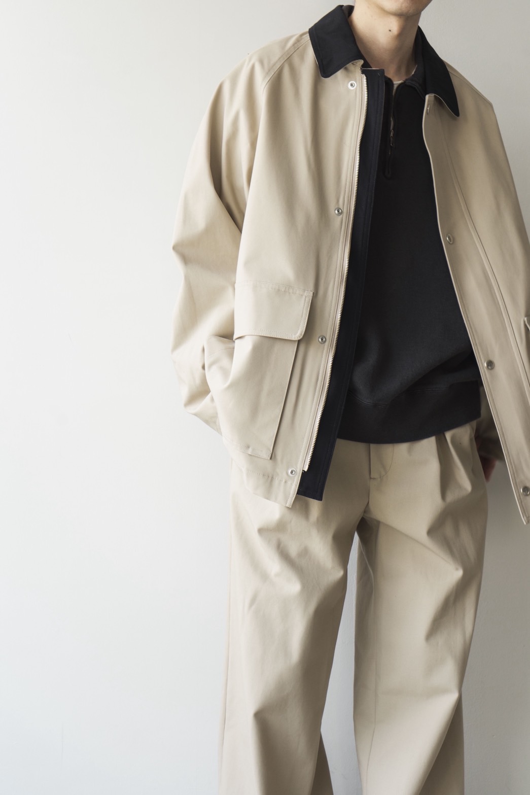 ジャケットは肩肘張らずに羽織れるリラックスバランス、パンツは腰回りにゆとりを持たせながらも、裾にかけて自然に整うバランスが特徴で、カジュアルにもクリーンにも振れるアイテムです。