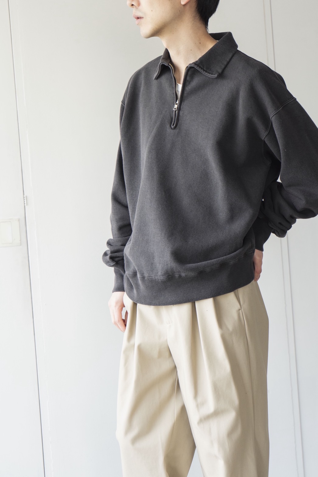 ピグメントバイオ加工を施したハーフジップスウェット。