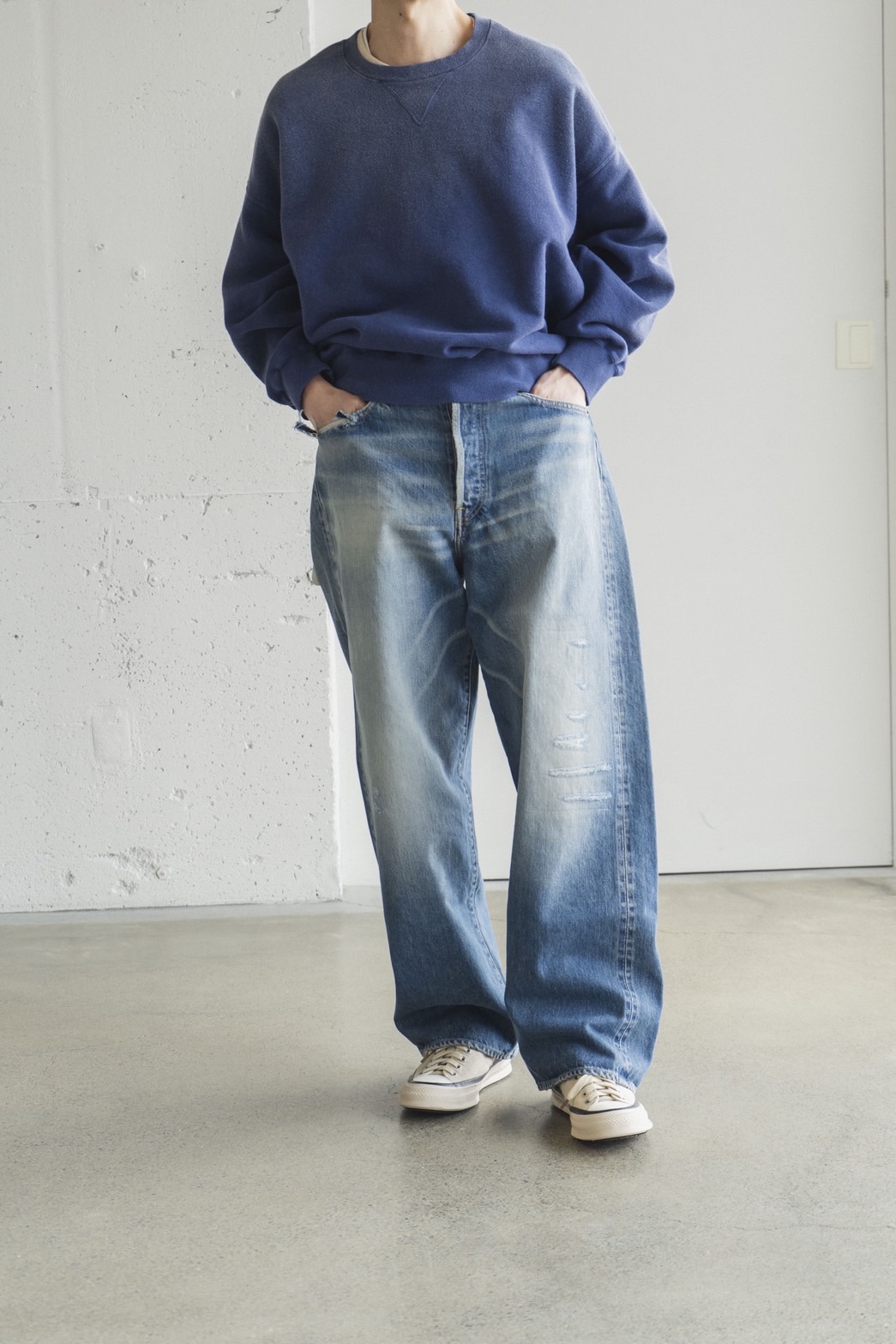 ダメージ加工による奥行きのある色落ちに、ブルーセルビッジや銅製ネオバボタンなどのオリジナルパーツを採用。