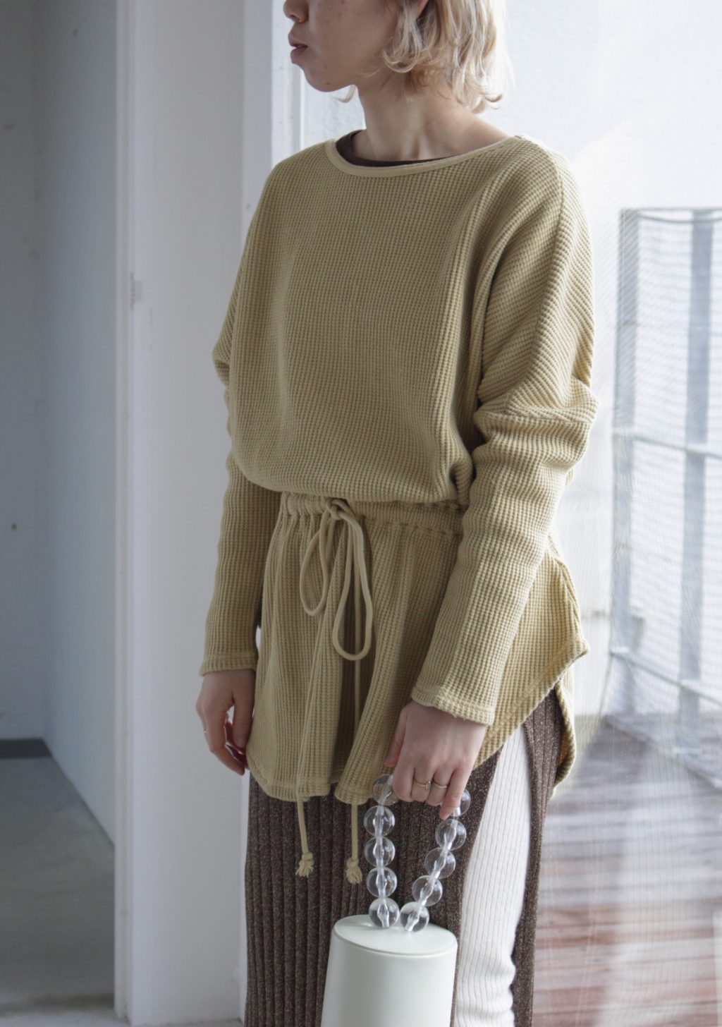 ヴィンテージ加工を施したワッフルカットソーは、ウェストはドローコードにより絞ることができ、スタイリングのポイントになります。程よい中肉厚で、スウェットのような着心地の良さと女性らしいシルエットになります。