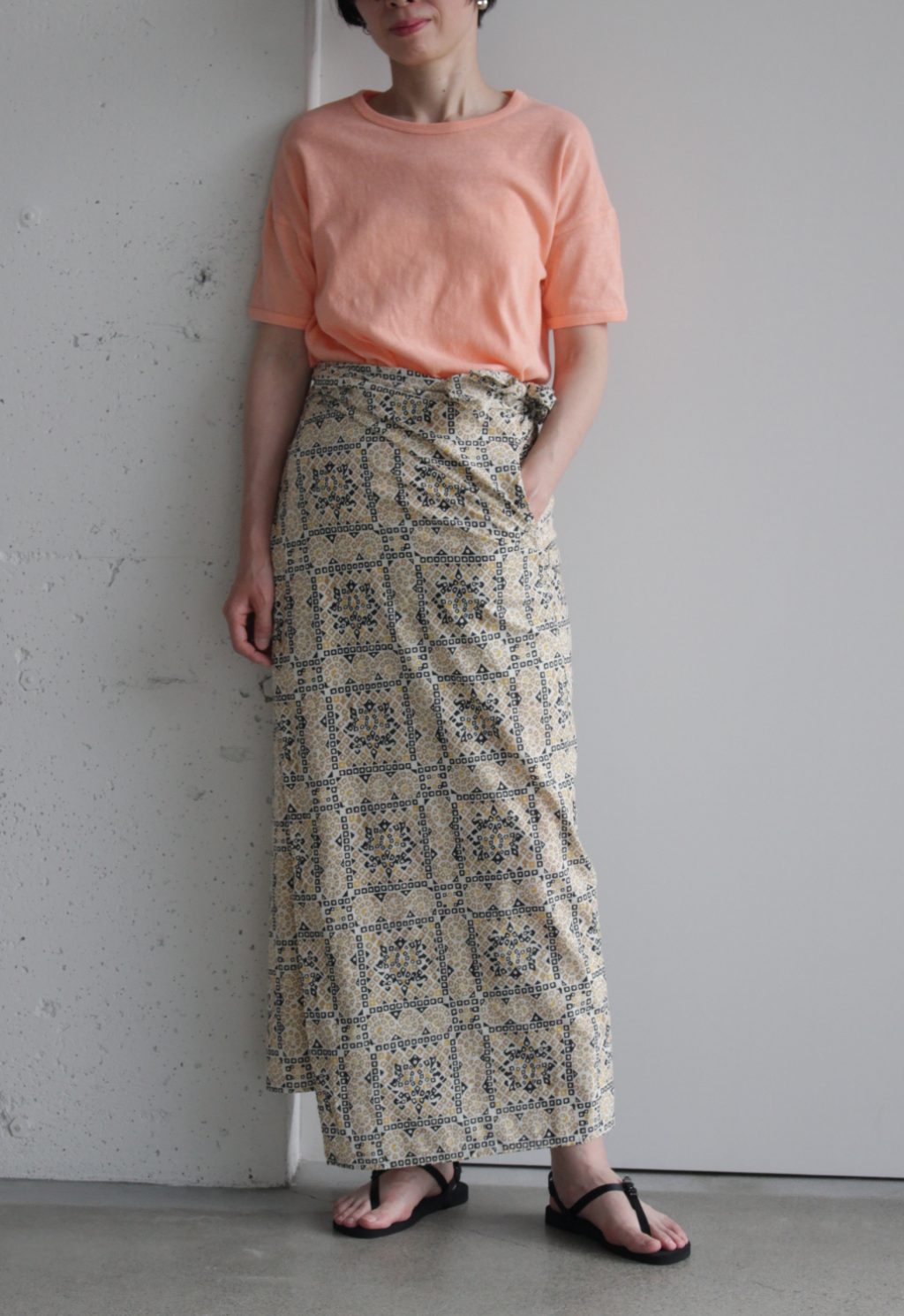 コットン100%のオリジナルテキスタイルを使用したラップスカートを合わせる事でリラクシーなリゾート感を演出しています。