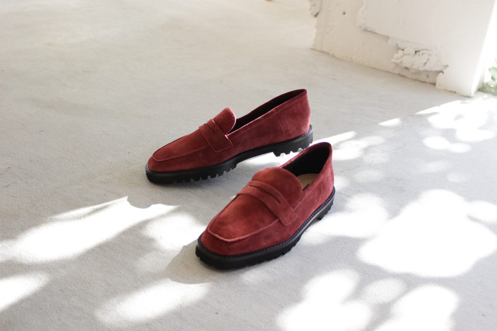 深いワイン色のスウェード素材とブラックのラバーソールが目を惹くローファーが入荷致しました。