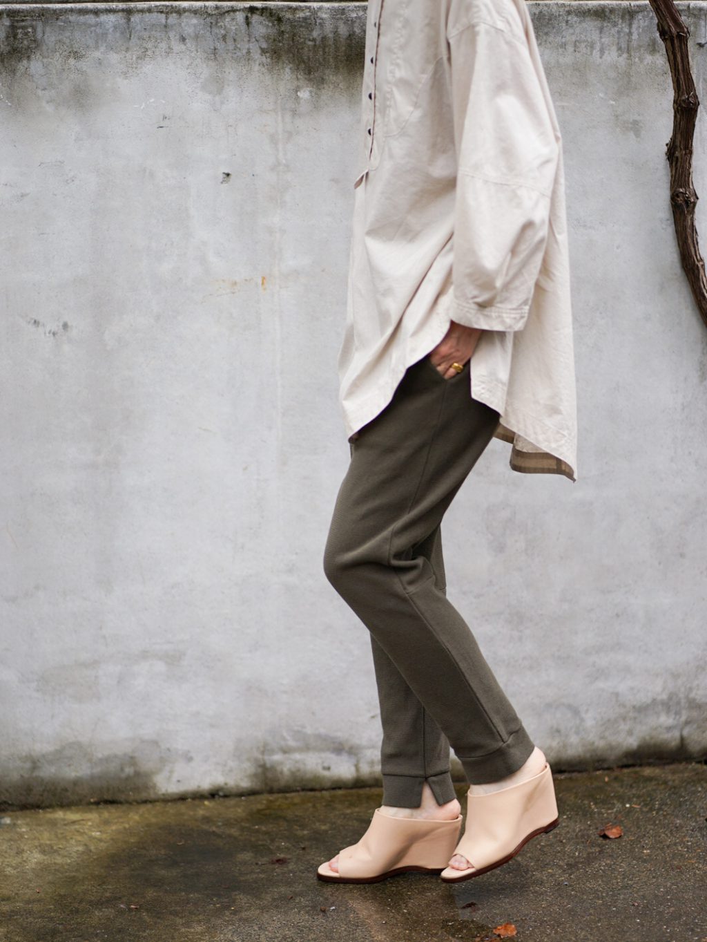 しっかりとした生地感ながら軽やかで肌触りがよく、同素材のトップスとセットアップでのワンマイルスタイルもおすすめです。