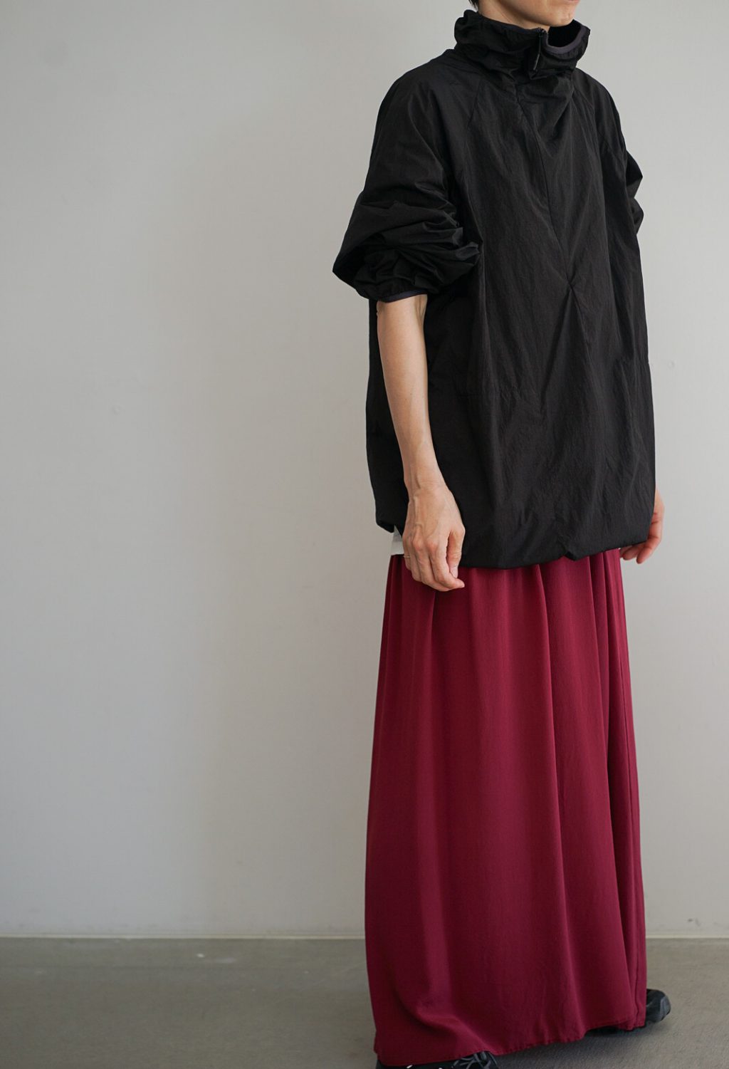 合わせたスカートもアシンメトリーヘムになっており、エアリーなフレアシルエットがエレガントな印象を与えます。