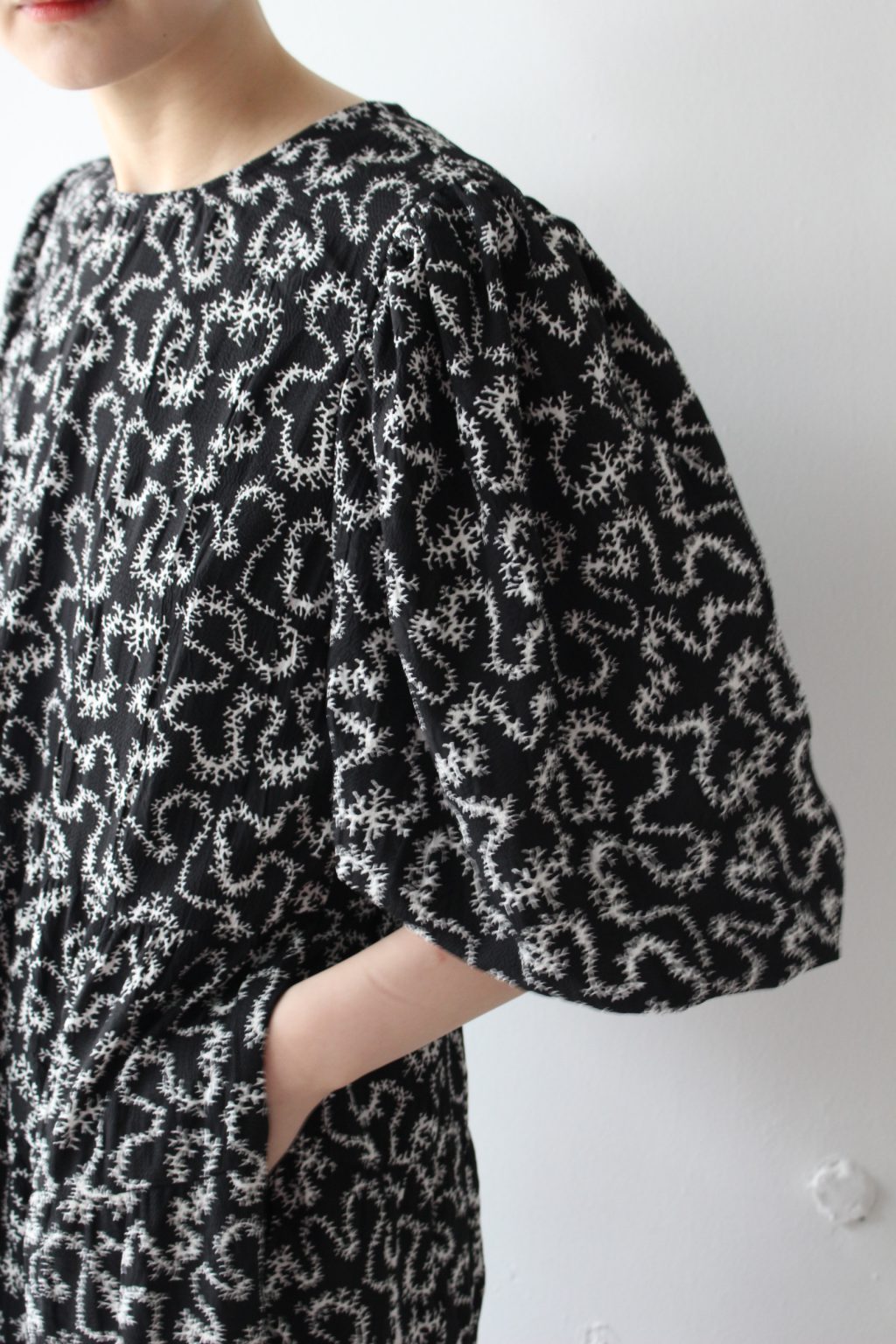 ギャザーを寄せた丸みのある袖のフォルムが特徴的となっており、裾にかけて広がるAラインシルエットで女性らしい雰囲気に仕上げた一枚です。