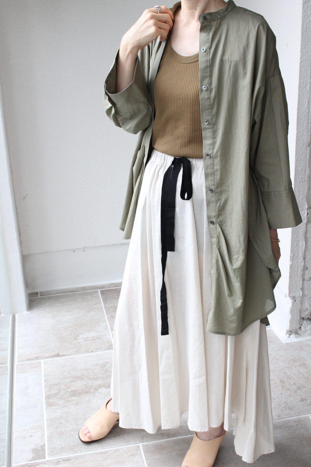 裾はアシンメトリーになっており、一枚でもさまになる一着です。