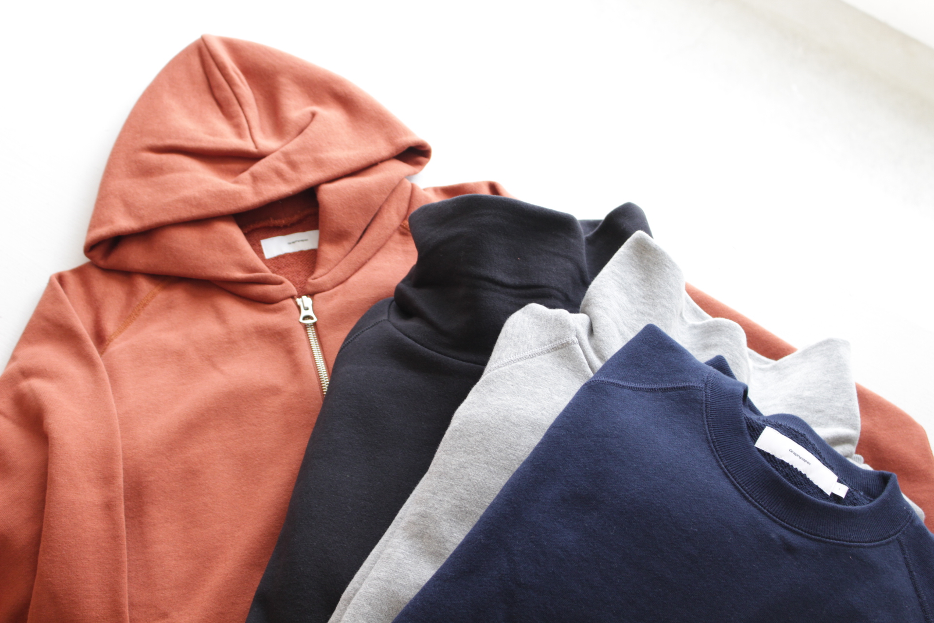 Graphpaperからは、メリノウールを使用したクルーネックセーターを始め、リラックス感のあるタートルや
