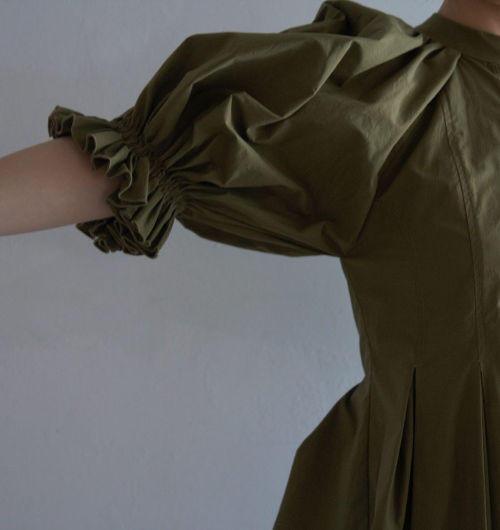 首元やウエストの詰まりとのバランスがコントラストになっています。