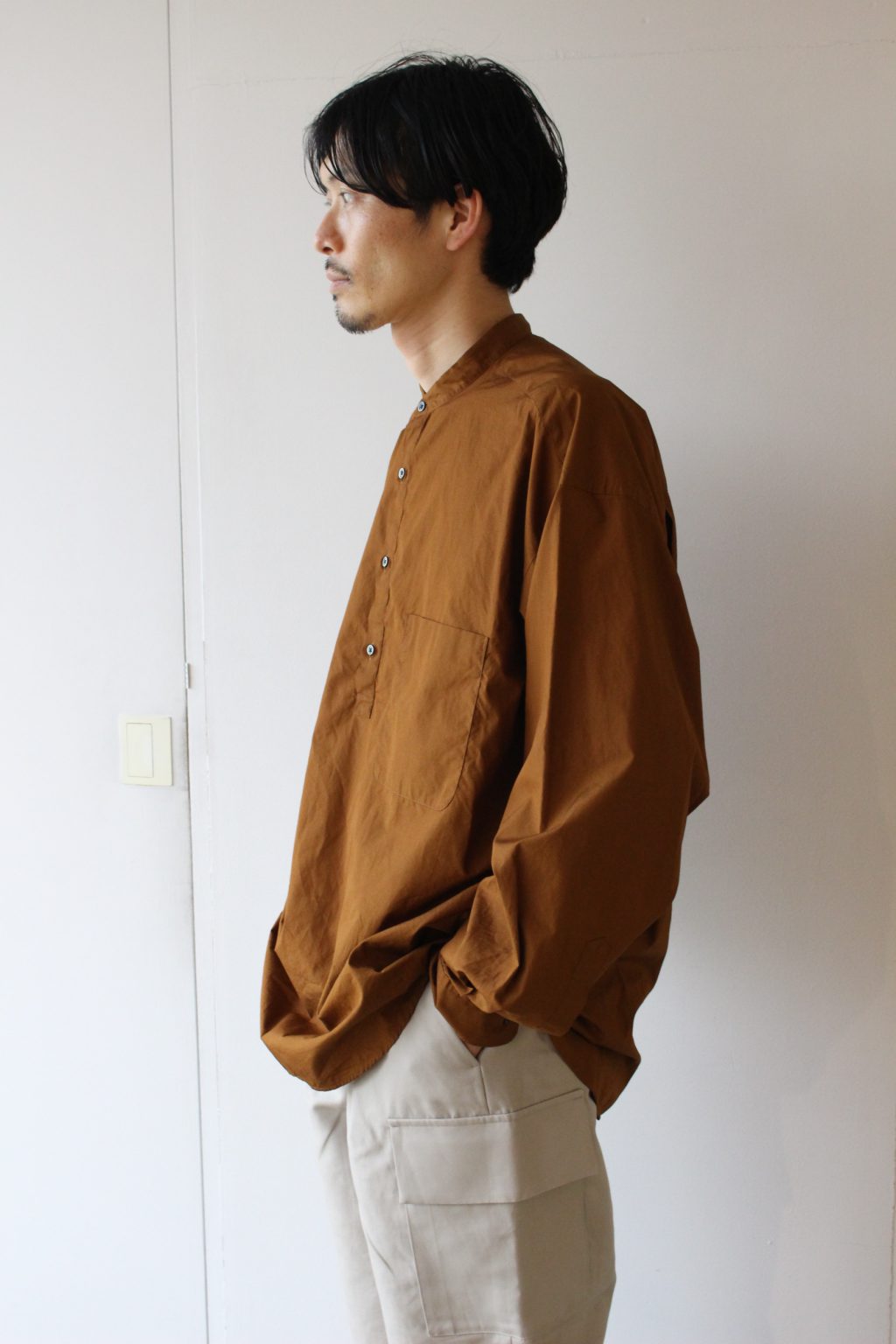 超長綿系の細番手で織られたブロード生地を使用したプルオーバータイプのバンドカラーシャツ。