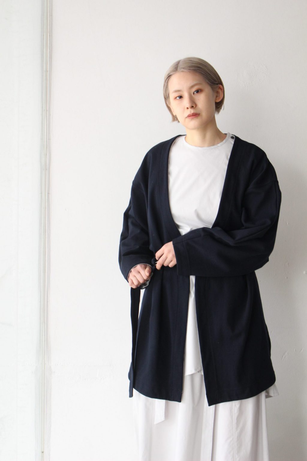 襟とボディーで色を切り替えたクレリックタイプとなっており、ゆとりのある身幅とスクエアにカットされすっきりとした着丈が特徴です。