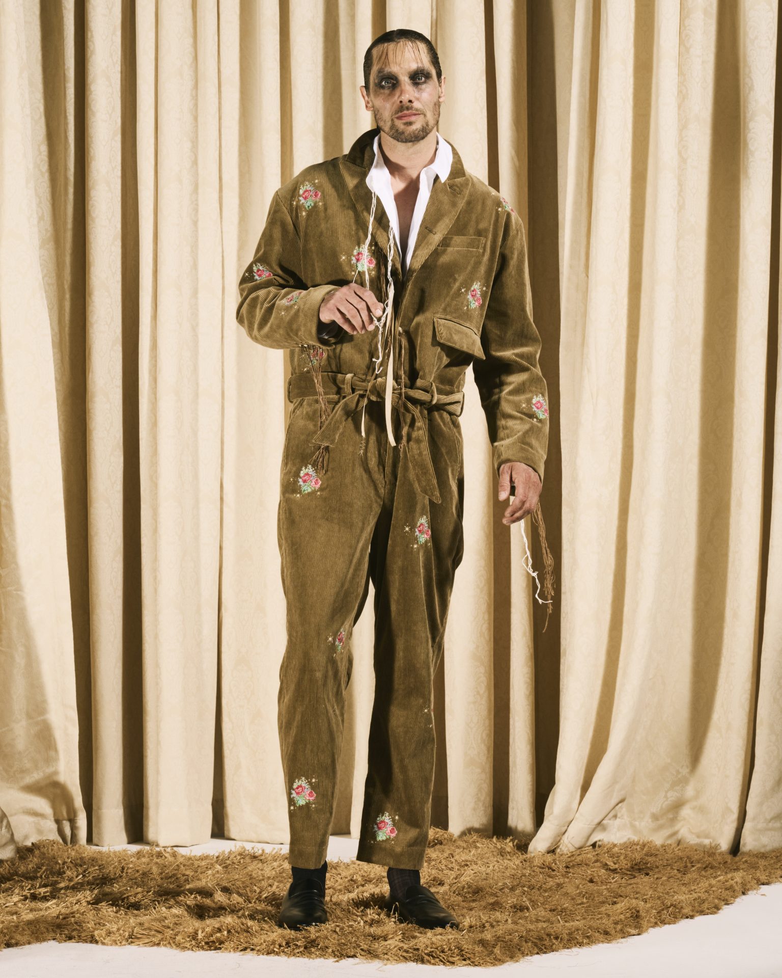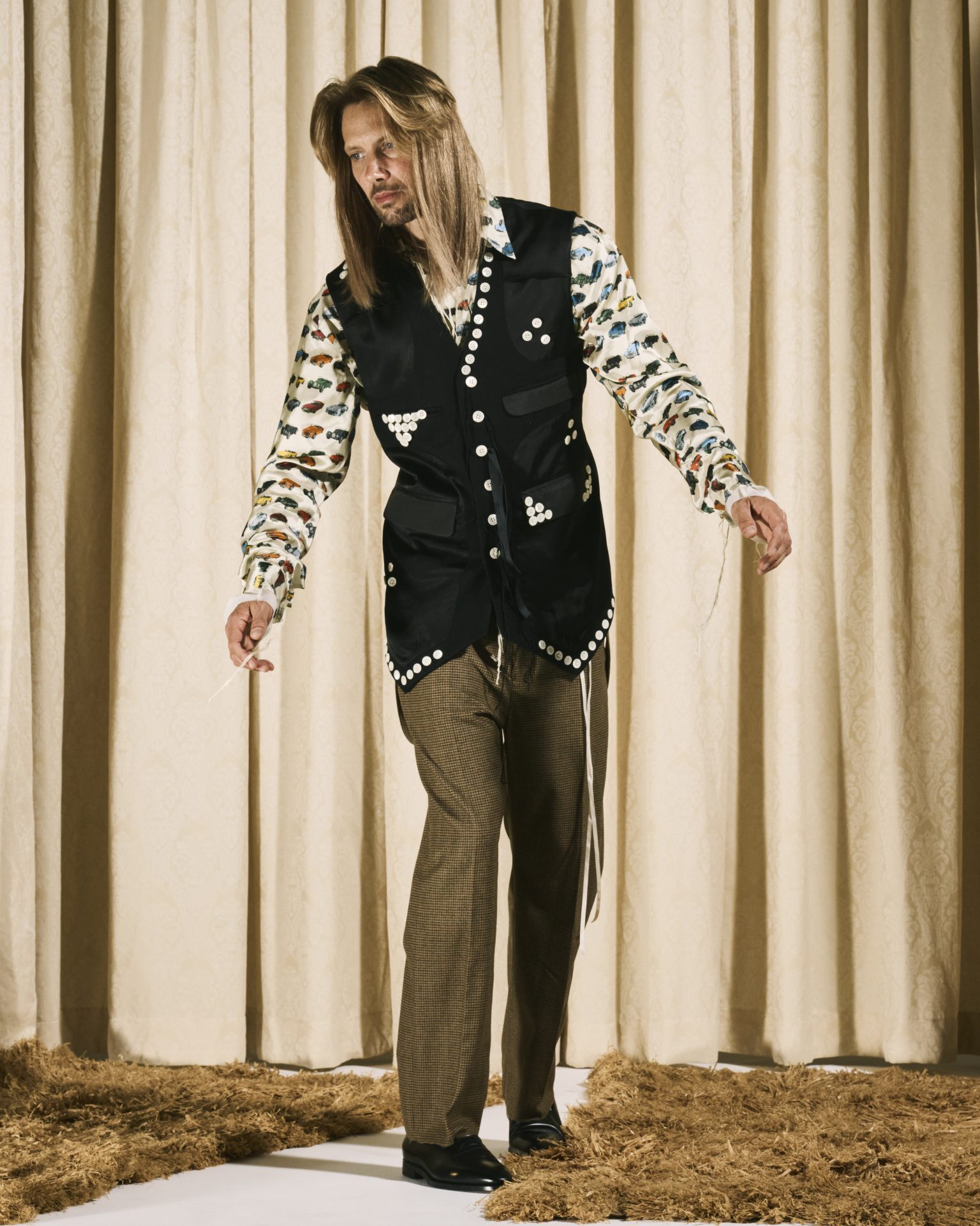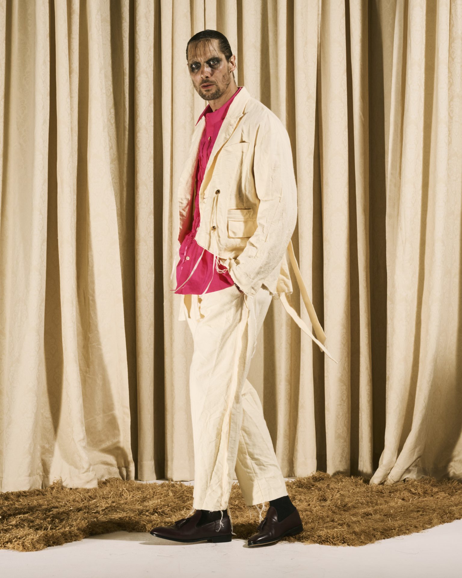 ブランドのオリジナルテキスタイルで製作されたジャケットとパンツ。