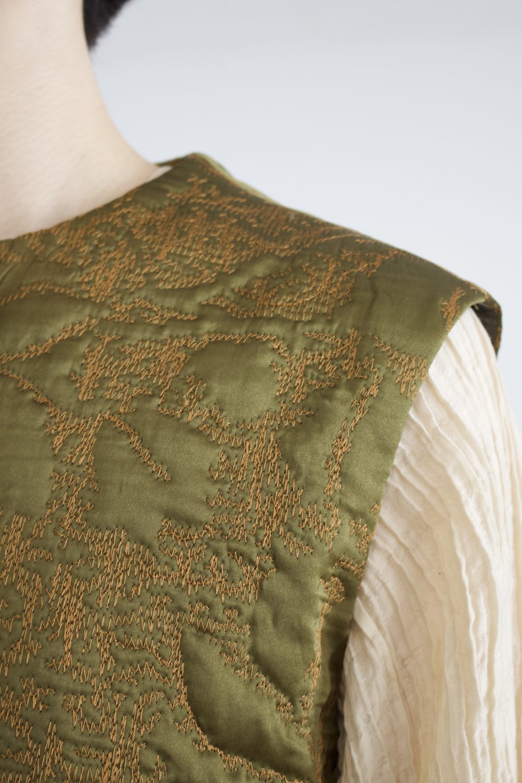 シルク素材にブランドオリジナルの刺繍を施すことで凹凸感が生まれた、フェミニンで女性らしいベストです。