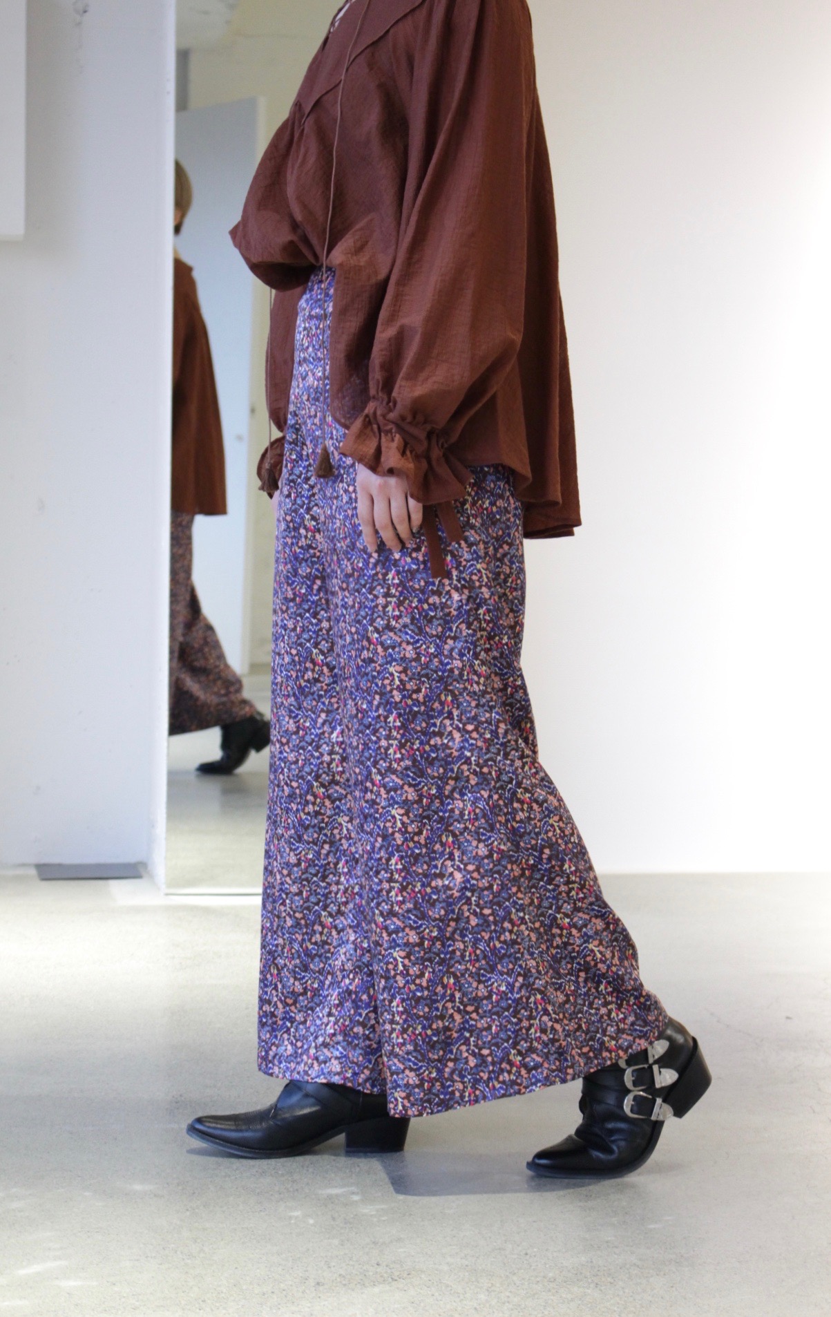 オリジナルテキスタイルを使用したパンツは、裾にかけてややフレアに広がるシルエットで