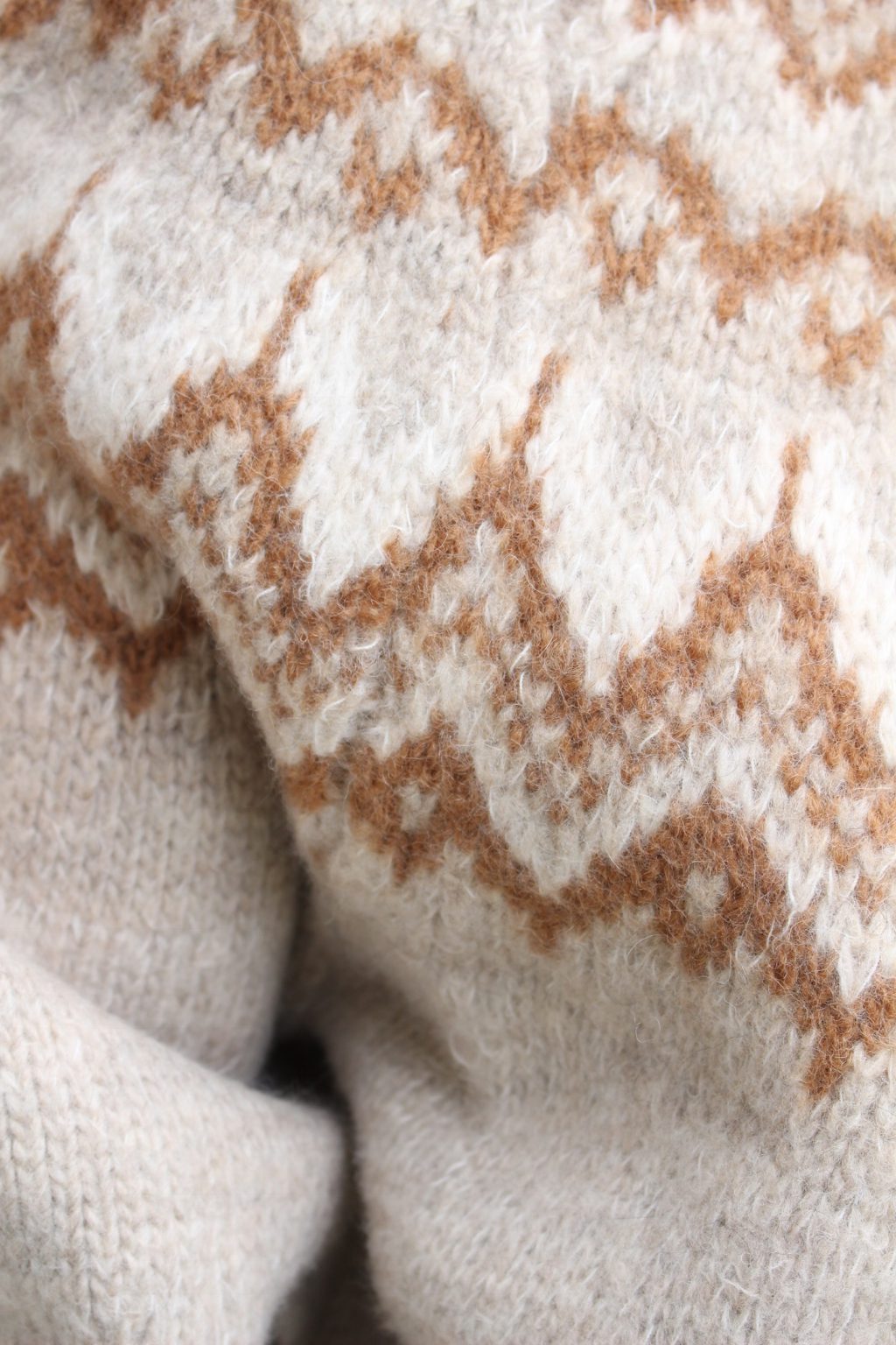ふんわりと立体感のあるニットプルオーバーは、ごく甘く撚りのかかったソフトなローピングウールと、フラワーモール糸を引き揃えて製作されたブランドオリジナルのフェアアイル柄を使用しています。