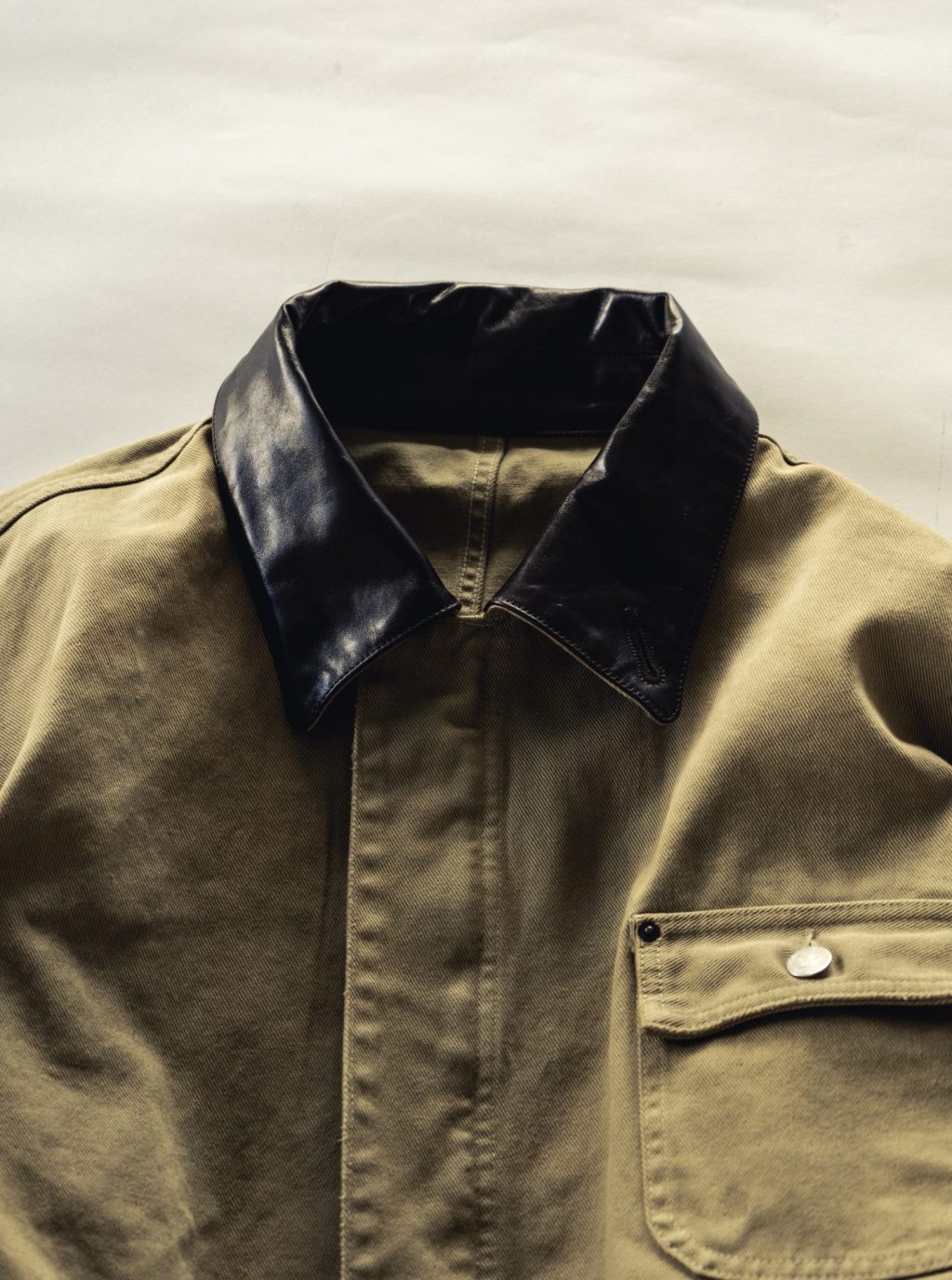 ヘビーコットンツイル生地に奥行きのあるダークブラウンのカウレザーでコントラストを出しています。