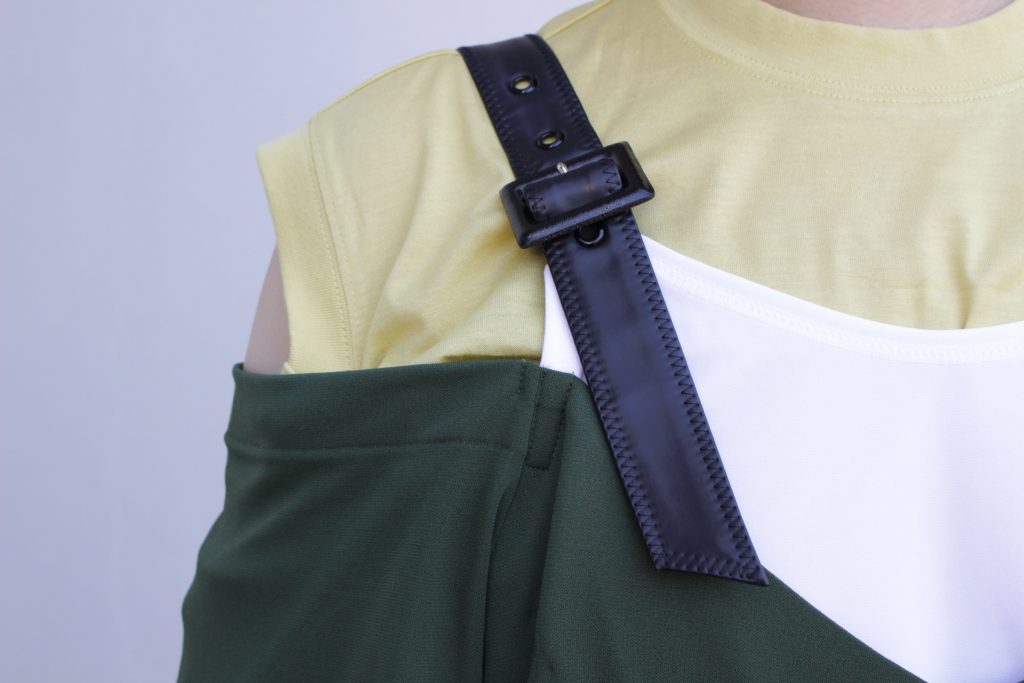 スタンドカラーネックで肩の内側にパッドを配することにより、クラシックなしっかりとした印象に。