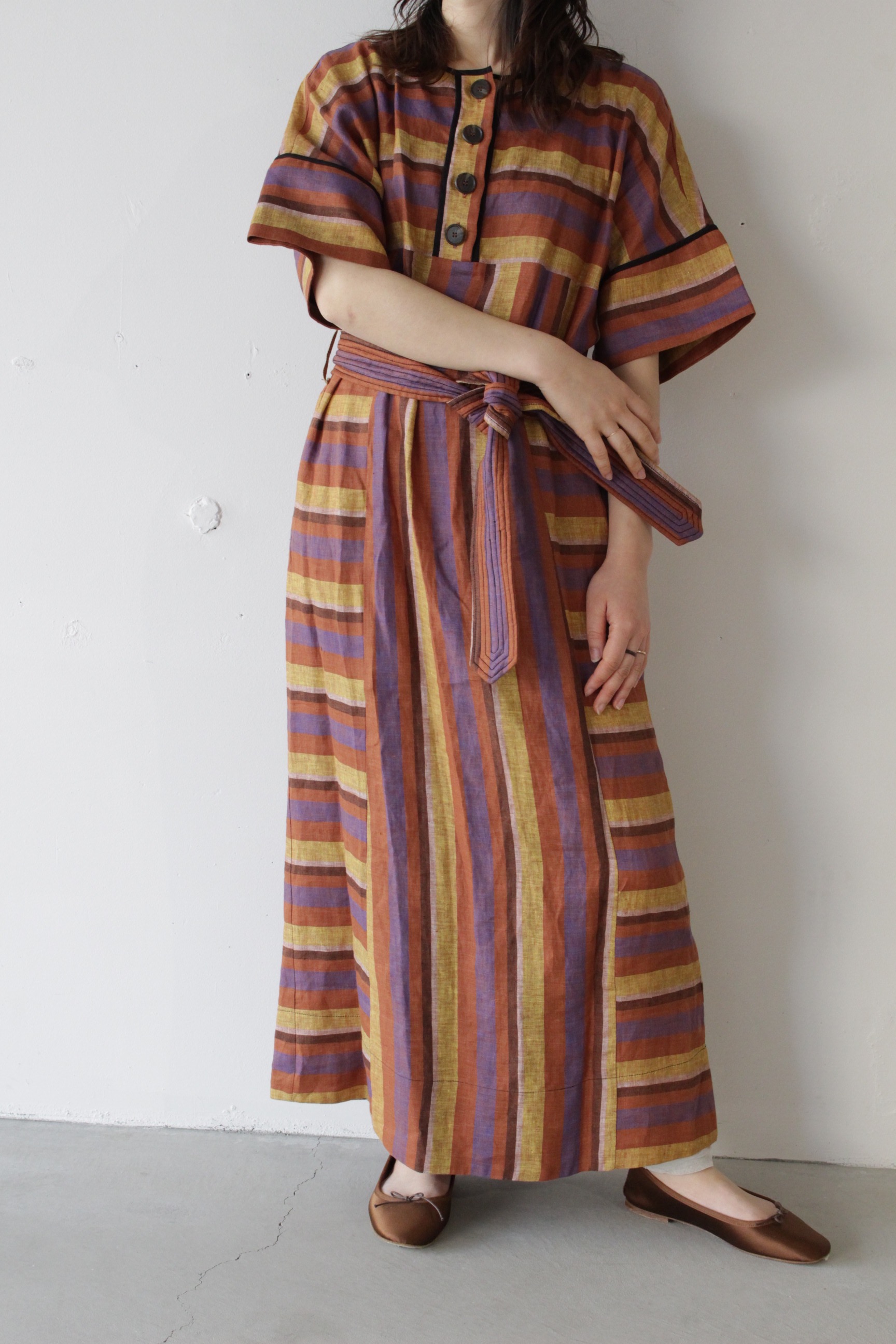 鮮やかなストライプがポイントのワンピースが入荷いたしました。シャリ感のあるリネン素材で雰囲気たっぷり。