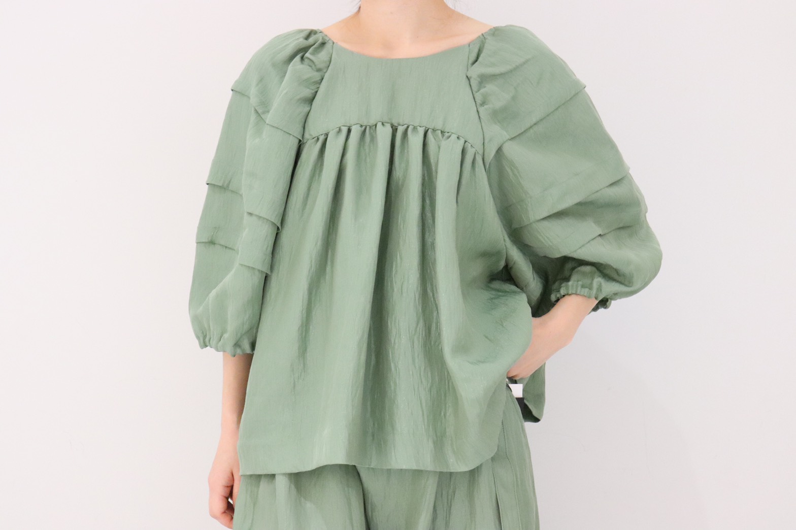 ふんわりとした袖が女性らしいブラウスはバックスタイルが大きく開き、エレガントな雰囲気に。