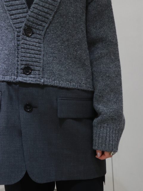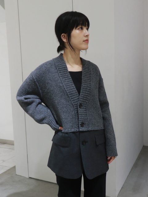 カーディガンとジャケットをレイヤードしたデザインは、硬さがありながらも気軽さもあるユニークなアイテム。