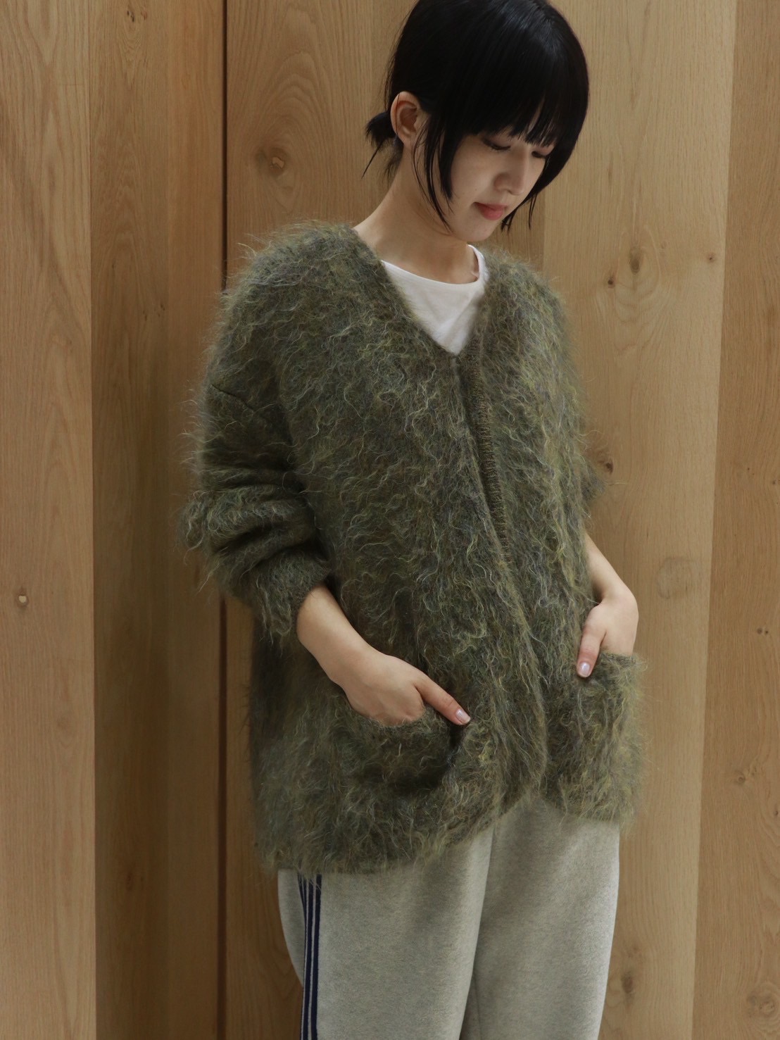 存在感溢れるニットは、モヘヤを使用して作られたVネックカーディガン。