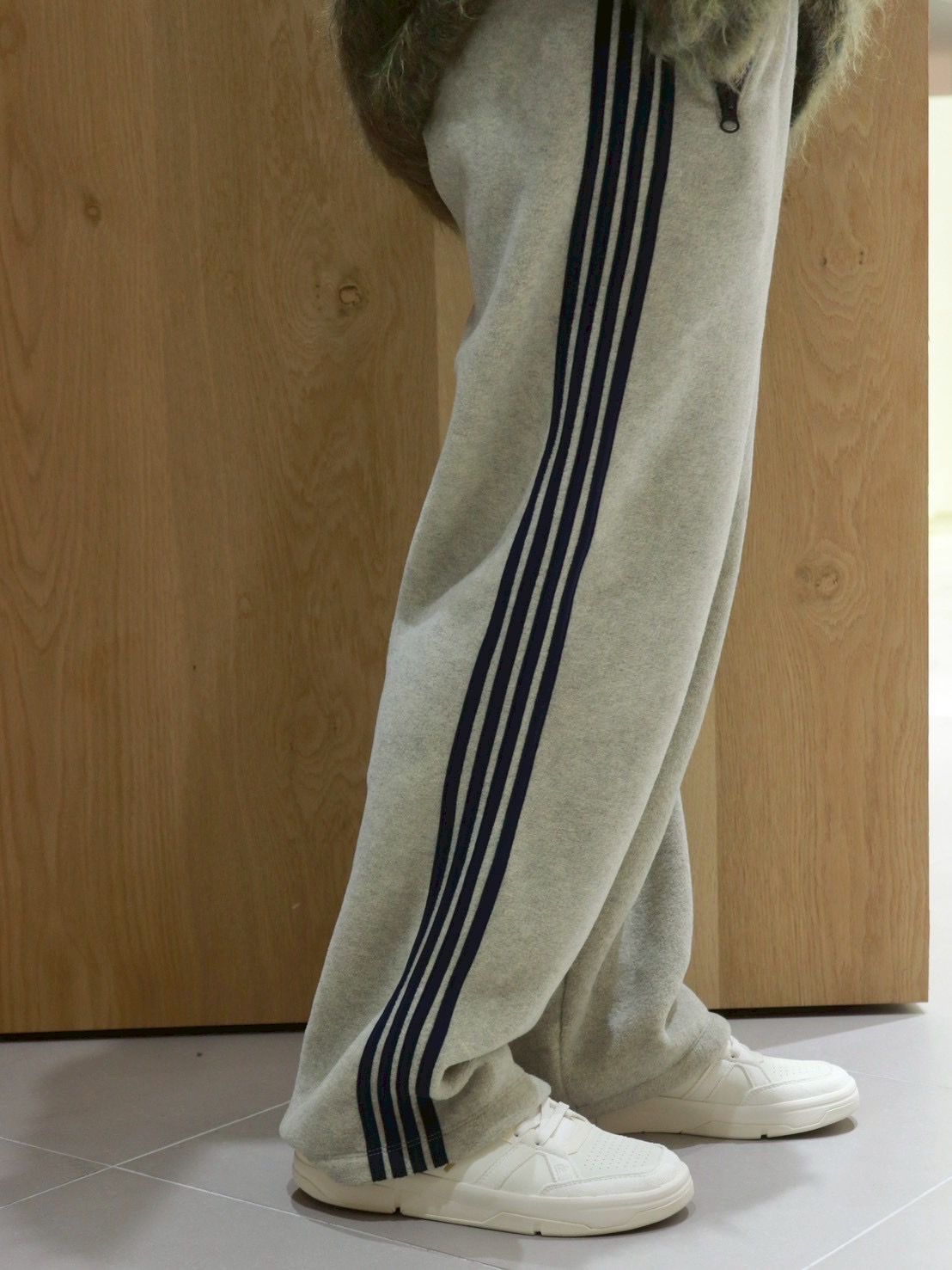 サイドラインが効いたウォーム感のあるフリースパンツを合わせて抜け感のある印象に。