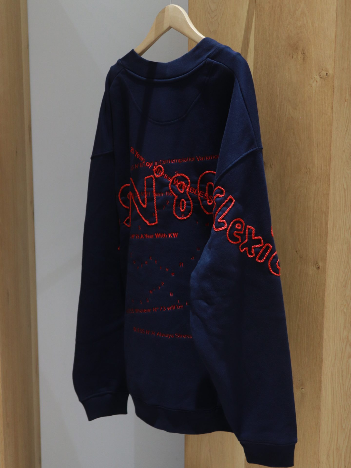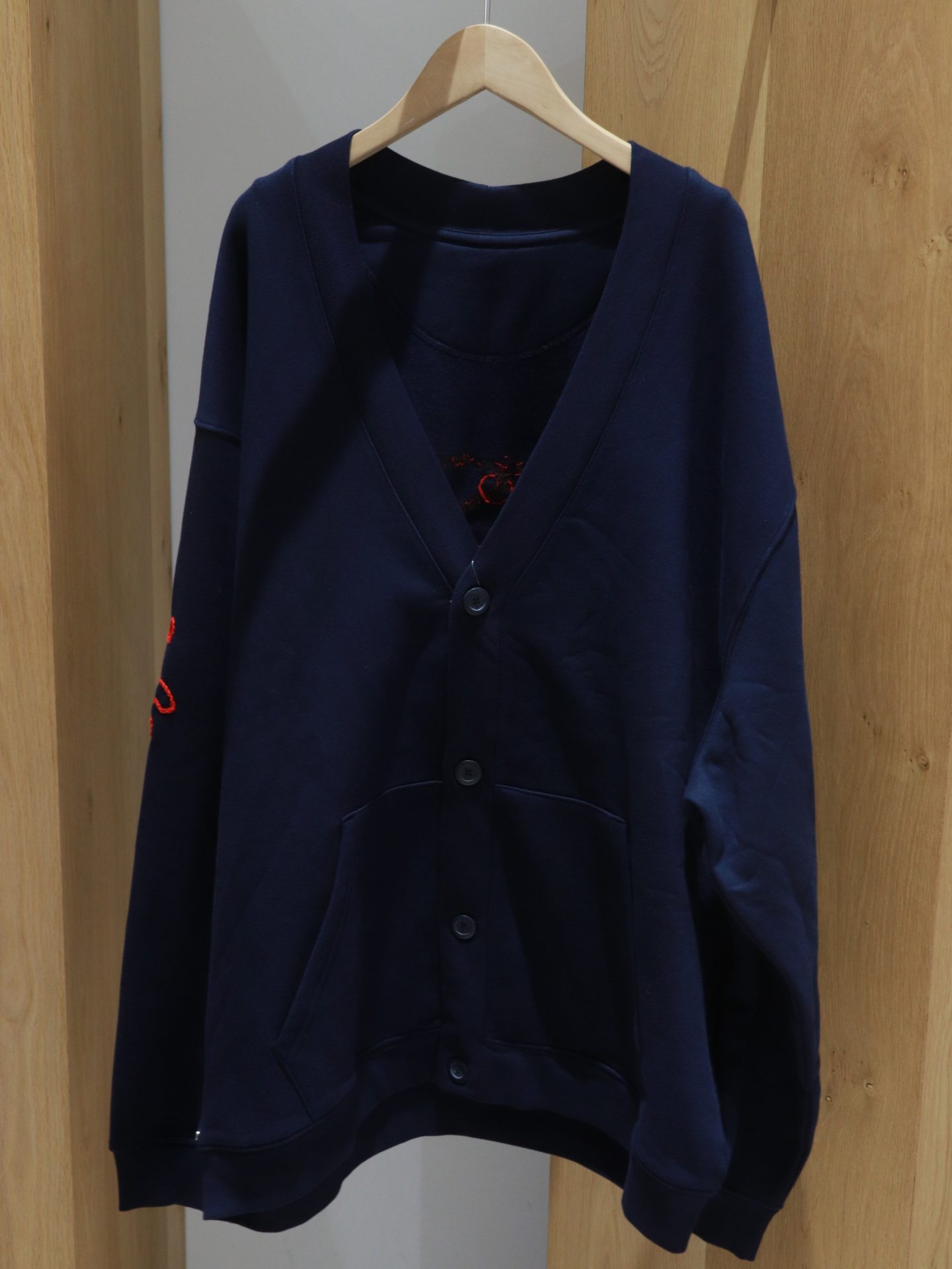 ネイビーのボディに赤い刺繍ロゴがアクセントになったスウェットジャケット。